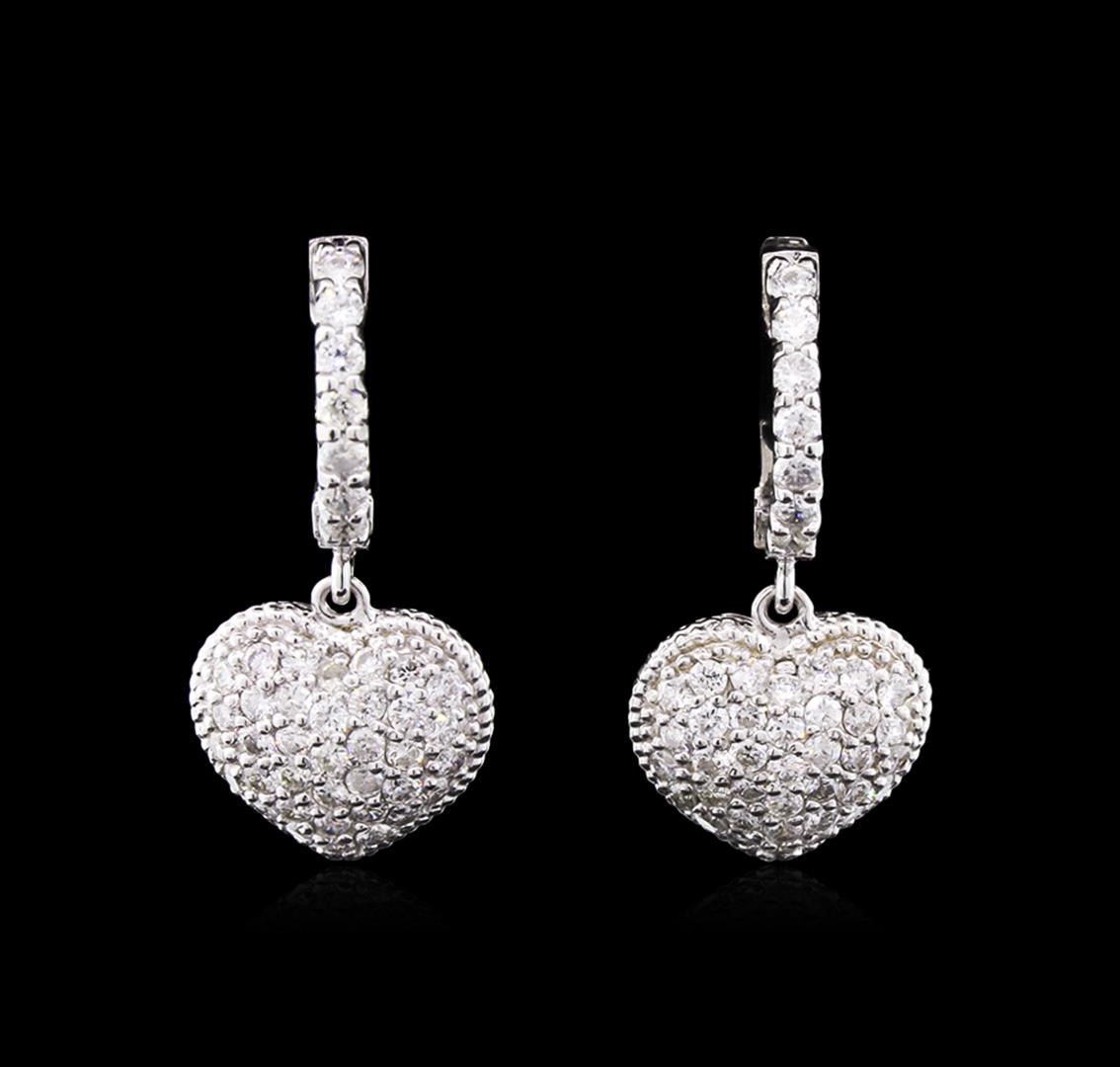 One pair electronically tested 14KT white gold lady's combination cast & assembled heart shape earrings with hinged, snap locking posts with a bright polish finish. Identified with markings of "K14". Condition is new, good workmanship. Containing: Fourteen prong set round brilliant cut diamonds, measuring 1.80 - 1.75 x 1.16mm (depth est.) approximate total weight of 14 Stones = 0.33ct. Graded in the setting. Clarity: SI-1 to SI-2 . Color: H - I. Cut Good Seventy-Four prong set round brilliant cut diamonds, measuring 1.50 - 1.45 x 0.96mm (depth est.) approximate total weight of 74 Stones = 0.97ct. Graded in the setting. Clarity: SI-1 to SI-2 . Color: H - I. Cut Good. Total Weight of Diamonds 1.30ct.. Total Weight of Earrings 5.40gm at $ 4560.00 GAS Appraised.