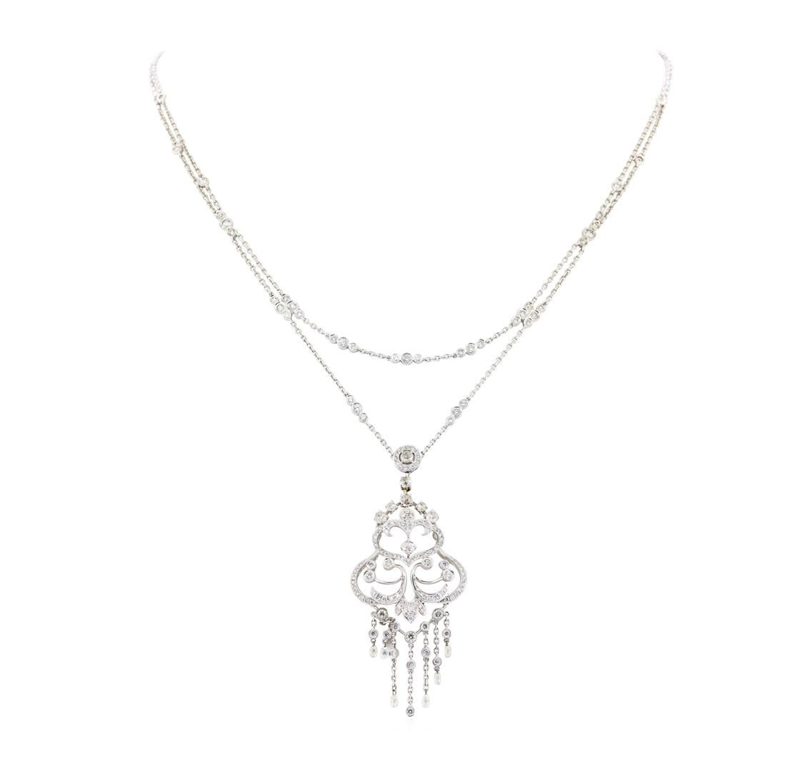 One electronically tested 14KT white gold lady's combination cast & assembled fashion chandelier style necklace with a lobster claw clasp with a bright polish with milgrain detailing finish. The featured lady's necklace has an adjustable clasp that can be worn between eighteen and twenty inches in length. Identified with markings of '14K'. Condition is new, good workmanship. Containing: Eight prong set rose cut diamonds, measuring 3.00 - 2.50 x 1.65mm (depth est.) approximate total weight of 8 Stones = 0.40ct. Graded in the setting. Color H - I Clarity VS-2 to SI-1 Cut Good Six claw set briolette cut diamonds, measuring 3.50 x 2.00 x 0.00mm (depth est.) approximate total weight of 6 Stones = 0.90ct. Graded in the setting. Color H - I Clarity SI-1 to SI-2 Cut Good Fifty-Seven bezel set round brilliant cut diamonds, measuring 2.00 - 1.60 x 1.12mm (depth est.) approximate total weight of 57 Stones = 1.25ct. Graded in the setting. Color H - I Clarity SI-1 to SI-2 Cut Good Ninety-Nine prong set round brilliant cut diamonds, measuring 1.40 - 1.30 x 0.84mm (depth est.) approximate total weight of 99 Stones = 0.95ct. Graded in the setting. Color H - I Clarity VS-2 to SI-2 Cut Good. Total Weight of Diamonds 3.50ct.. Total Weight of Necklace 14.10gm GAS Appraised at $7840.00. GAS Appraised at $7,840.00.
