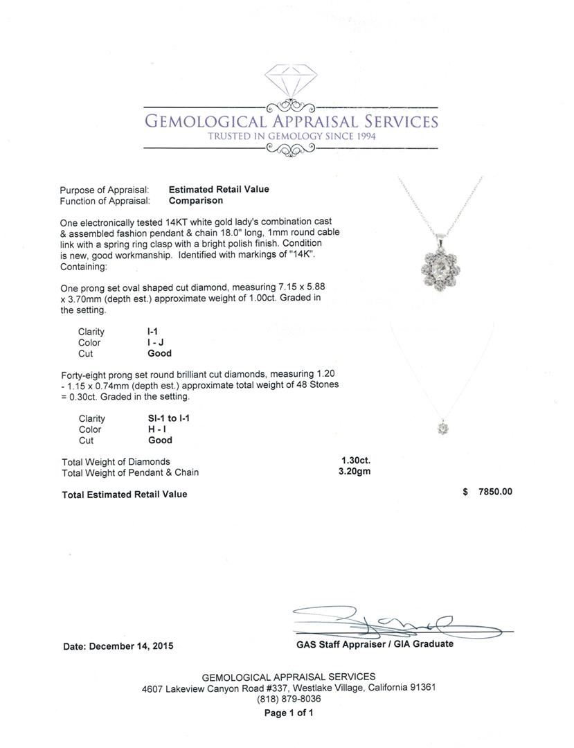 One electronically tested 14KT white gold lady's combination cast & assembled fashion pendant & chain 18.0" long, 1mm round cable link with a spring ring clasp with a bright polish finish. Identified with markings of "14K". Condition is new, good workmanship. Containing: One prong set oval shaped cut diamond, measuring 7.15 x 5.88 x 3.70mm (depth est.) approximate weight of 1.00ct. Graded in the setting. Clarity: I-1. Color: I - Good Forty-Eight prong set round brilliant cut diamonds, measuring 1.20 - 1.15 x 0.74mm (depth est.) approximate total weight of 48 Stones = 0.30ct. Graded in the setting. Clarity: SI-1 to I-1. Color: H - I. Cut Good. Total Weight of Diamonds 1.30ct. Total Weight of Pendant & Chain 3.20gm. GAS Appraised at $7,850.00.