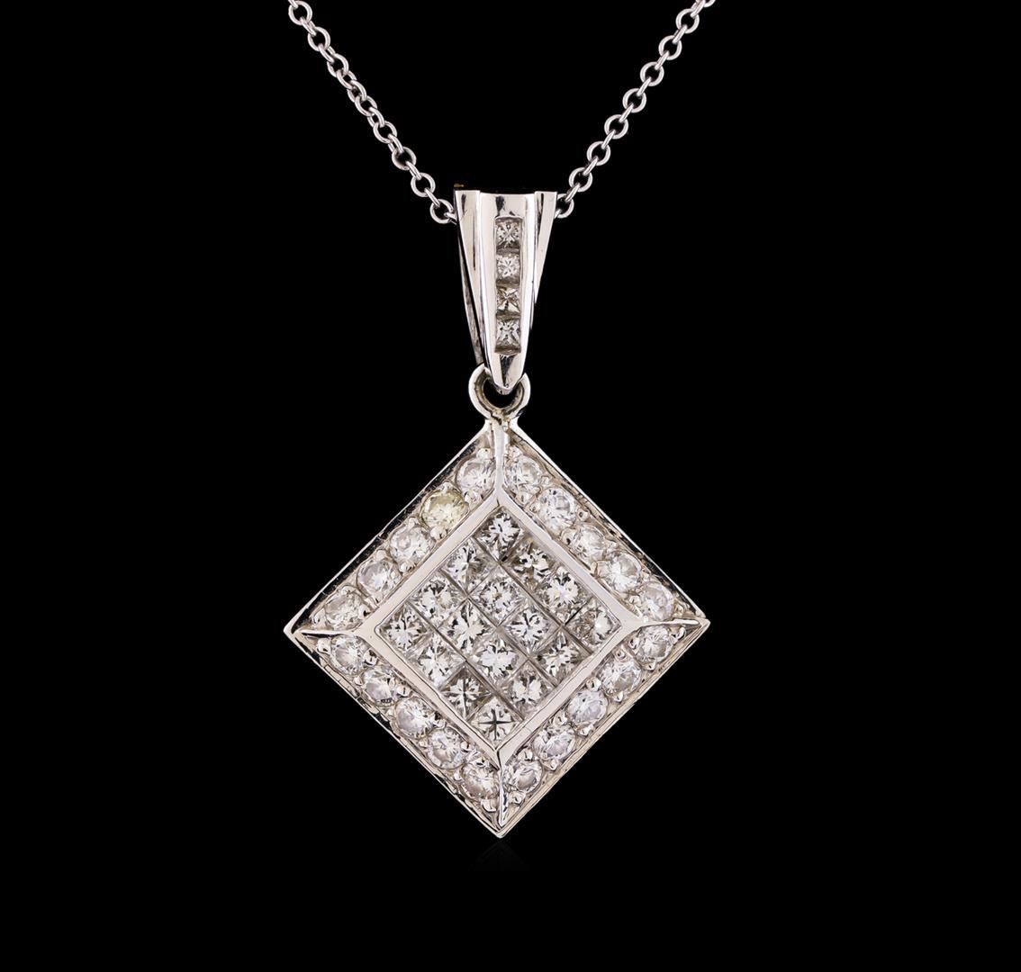 One electronically tested 14KT white gold ladies cast & assembled diamond pendant with chain. The pendant features a princess cut diamond gallery set within a diamond bezel, completed by a diamond ribbon bail. The pendant is supported by a sixteen inch length 14KT white gold cable chain, terminating in a spring ring clasp. Bright polish finish. Identified with markings of '14K'. Condition is good. Containing: Twenty invisible set princess cut diamonds (depth est.) approximate total weight of 20 Stones = 0.80ct. Graded in the setting. Clarity SI-1 to I-1. Color: F - H Twenty prong set round brilliant cut diamonds, measuring 2.00 - 1.90 x 1.17mm (depth est.) approximate total weight of 20 Stones = 0.50ct. The color and clarity grades reflect the entire ranges of color and clarity for this group. Graded in the setting. Clarity SI-1 to I-2. Color: F - I. Total Weight of Diamonds 1.30ct.. Total Weight of Pendant With Chain 3.55gm. AIG Appraised at $3,480.00.