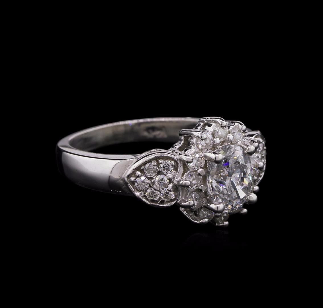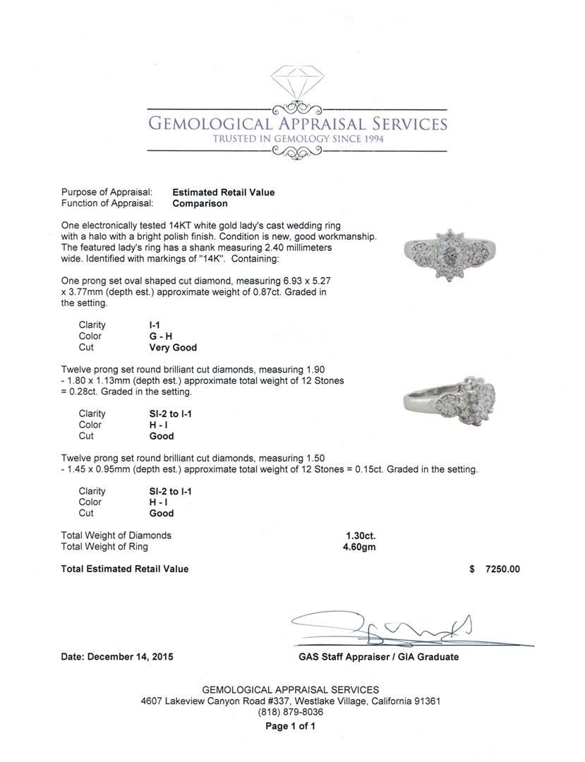 One electronically tested 14KT white gold lady's cast wedding ring with a halo with a bright polish finish. The featured lady's ring has a shank measuring 2.40 millimeters wide. Identified with markings of "14K". Condition is new, good workmanship. Containing: One prong set oval shaped cut diamond, measuring 6.93 x 5.27 x 3.77mm (depth est.) approximate weight of 0.87ct. Graded in the setting. Clarity: I-1. Color: G - Very Good Twelve prong set round brilliant cut diamonds, measuring 1.90 - 1.80 x 1.13mm (depth est.) approximate total weight of 12 Stones = 0.28ct. Graded in the setting. Clarity: SI-2 to I-1. Color: H - I. Cut Good Twelve prong set round brilliant cut diamonds, measuring 1.50 - 1.45 x 0.95mm (depth est.) approximate total weight of 12 Stones = 0.15ct. Graded in the setting. Clarity: SI-2 to I-1. Color: H - I. Cut Good. Total Weight of Diamonds 1.30ct. Total Weight of Ring 4.60gm. GAS Appraised at $7,250.00.