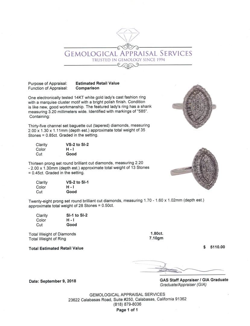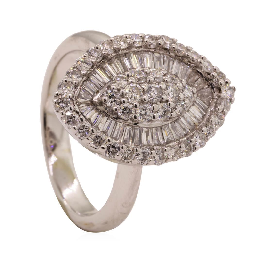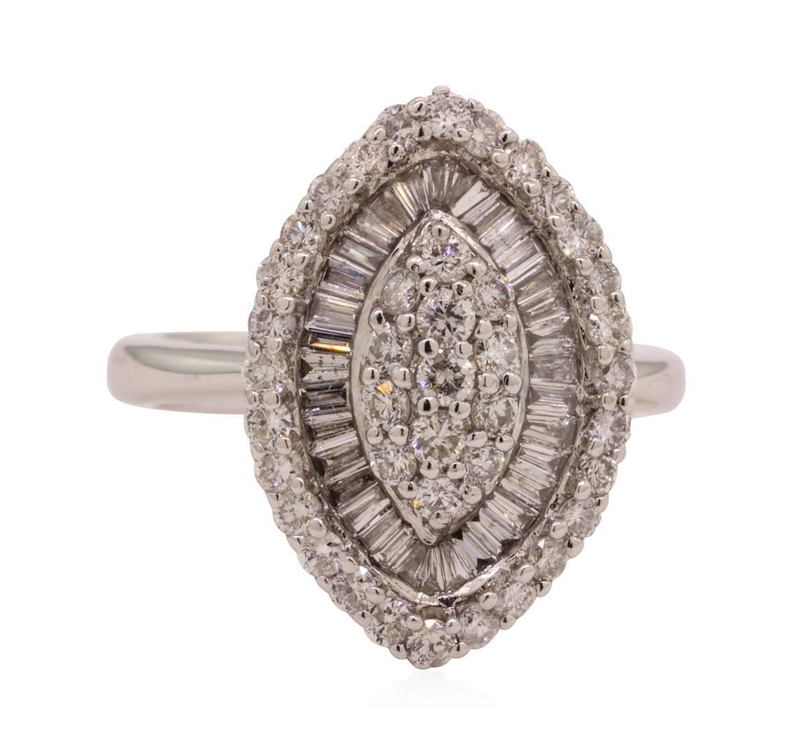One electronically tested 14KT white gold lady's cast fashion ring with a marquise cluster motif with a bright polish finish. The featured lady's ring has a shank measuring 3.20 millimeters wide. Identified with markings of '585'. Condition is like new, g