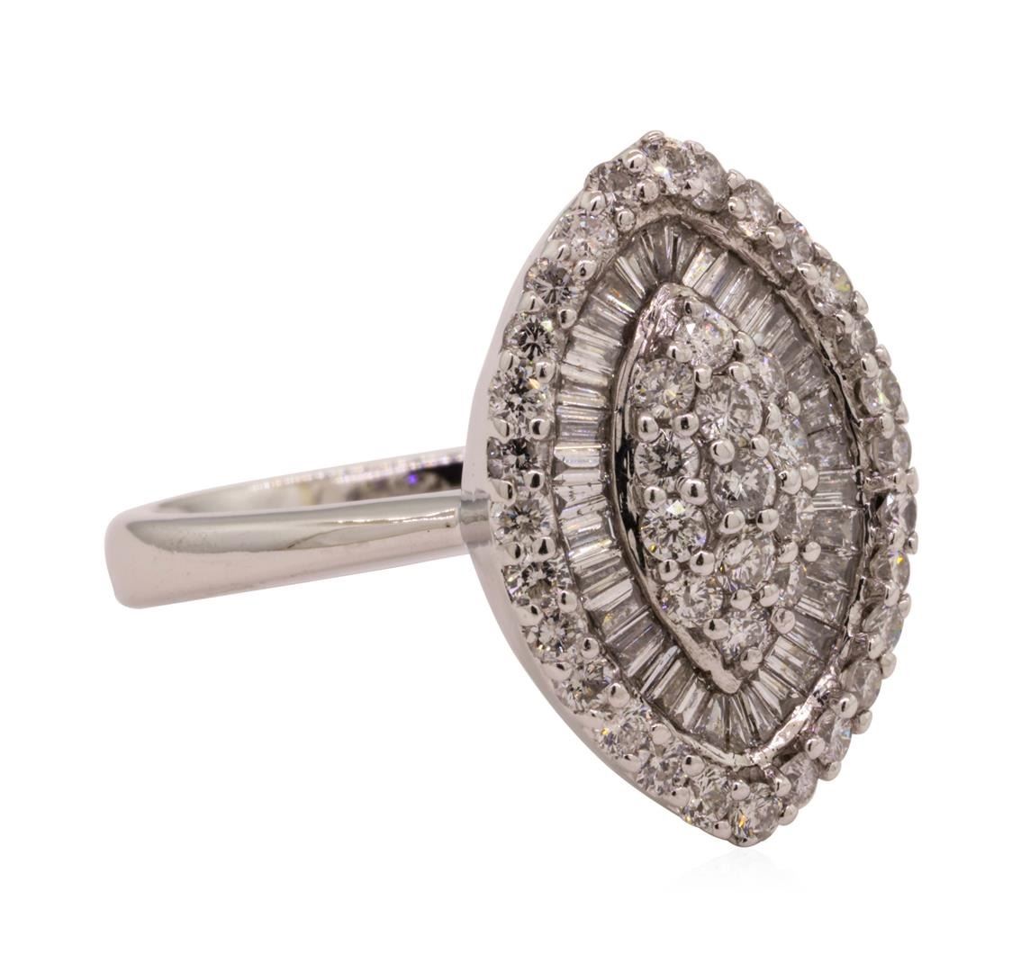 One electronically tested 14KT white gold lady's cast fashion ring with a marquise cluster motif with a bright polish finish. The featured lady's ring has a shank measuring 3.20 millimeters wide. Identified with markings of '585'. Condition is like new, g