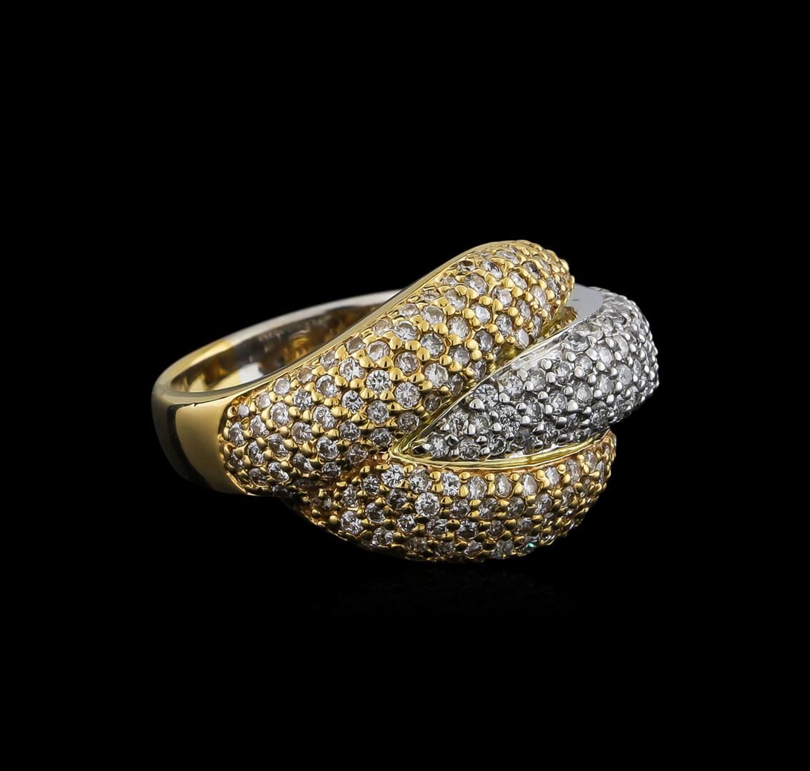 One electronically tested 14KT white and yellow gold lady's combination cast & assembled fashion ring with a bright polish finish. The featured lady's ring has a shank measuring 4.04 millimeters wide. Identified with markings of "14K". Condition is new, good workmanship. Containing: Two Hundred prong set round brilliant cut diamonds, measuring 1.30 - 1.10 x 0.74mm (depth est.) approximate total weight of 200 Stones = 1.30ct. Graded in the setting. Clarity: SI-1 to I-1. Color: G - I. Cut Good. Total Weight of Diamonds 1.30ct. Total Weight of Ring 9.60gm. GAS Appraised at $6,140.00.