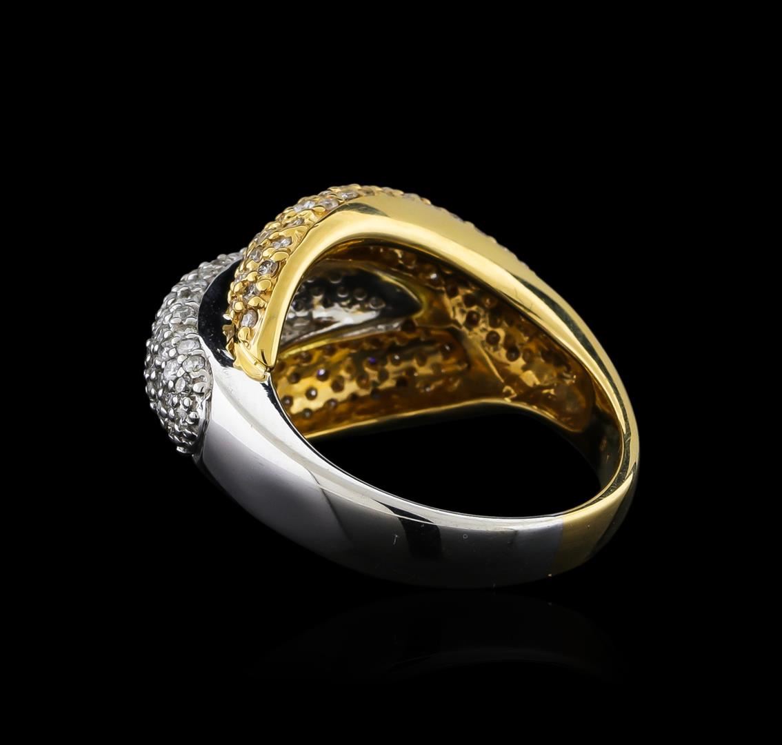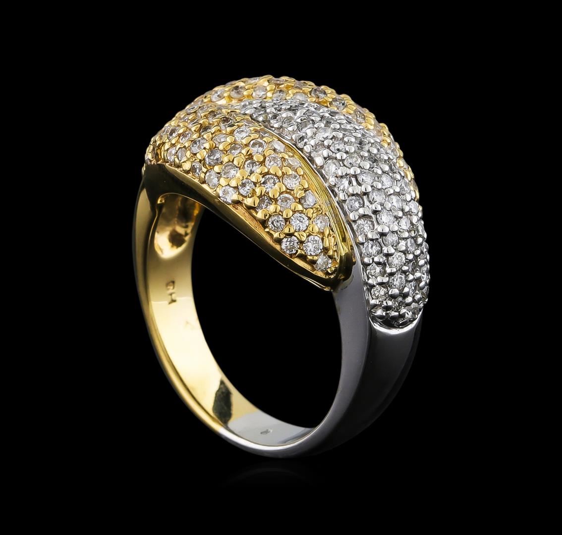 One electronically tested 14KT white and yellow gold lady's combination cast & assembled fashion ring with a bright polish finish. The featured lady's ring has a shank measuring 4.04 millimeters wide. Identified with markings of "14K". Condition is new, good workmanship. Containing: Two Hundred prong set round brilliant cut diamonds, measuring 1.30 - 1.10 x 0.74mm (depth est.) approximate total weight of 200 Stones = 1.30ct. Graded in the setting. Clarity: SI-1 to I-1. Color: G - I. Cut Good. Total Weight of Diamonds 1.30ct. Total Weight of Ring 9.60gm. GAS Appraised at $6,140.00.