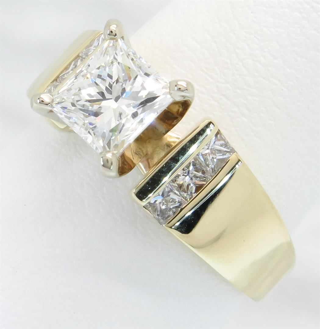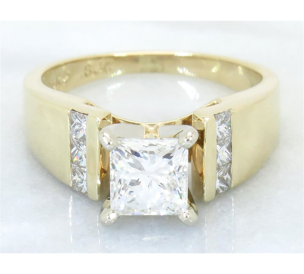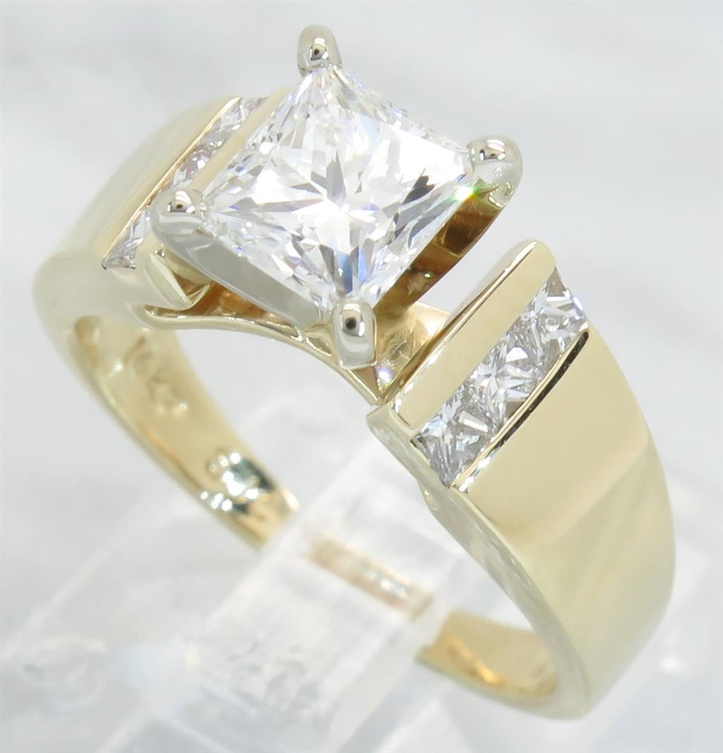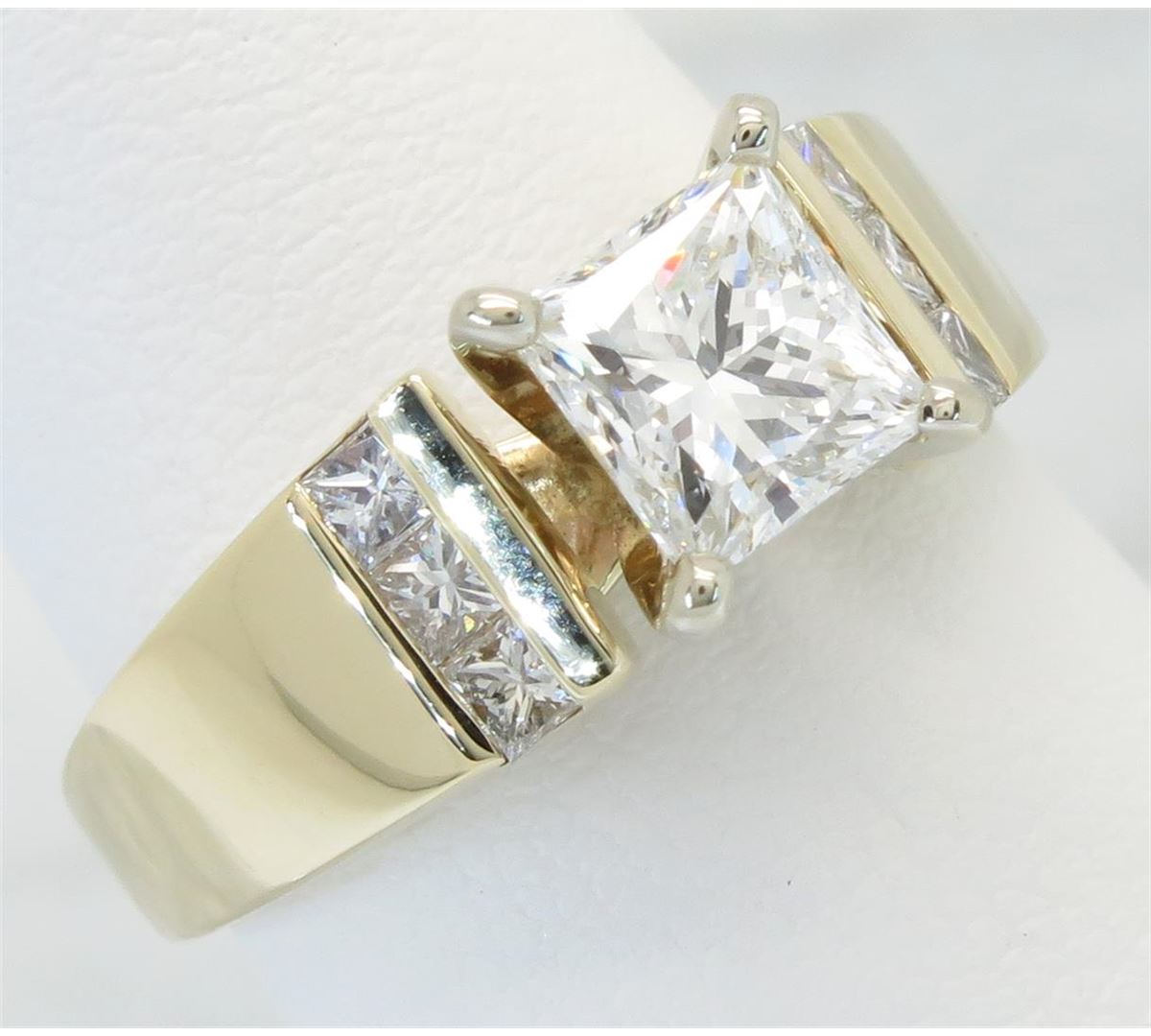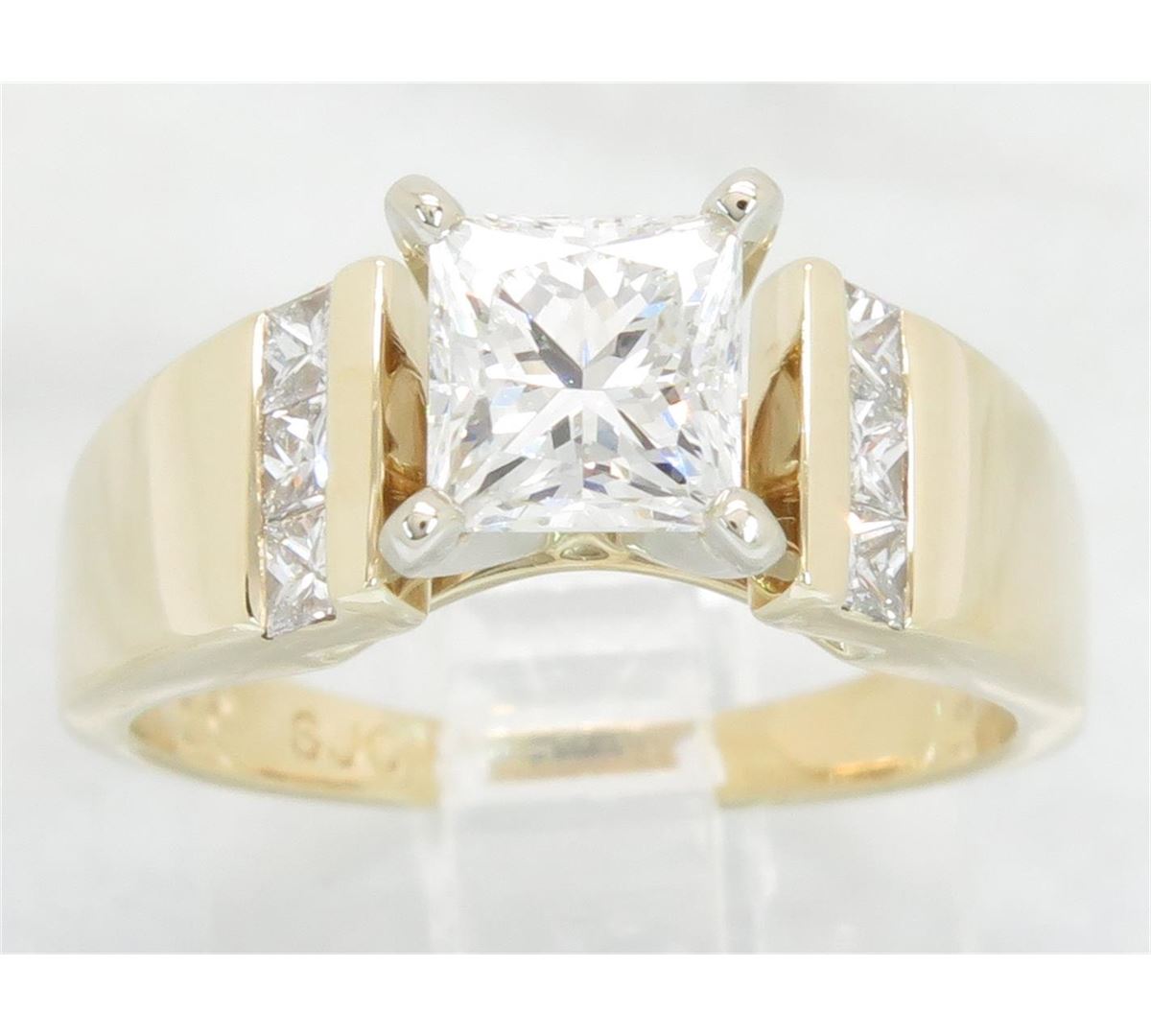 One tested 14K yellow gold diamond ring. Containing: One 1.00CT Princess Cut Diamond. Clarity: VS2, Color: F-G. 6 Princess Cut Diamonds. Approximate total diamond weight: 1.30CTW. All diamonds are graded in the mounting unless otherwise stated. Weight of ring: 4.8 grams, Size: 4.75.