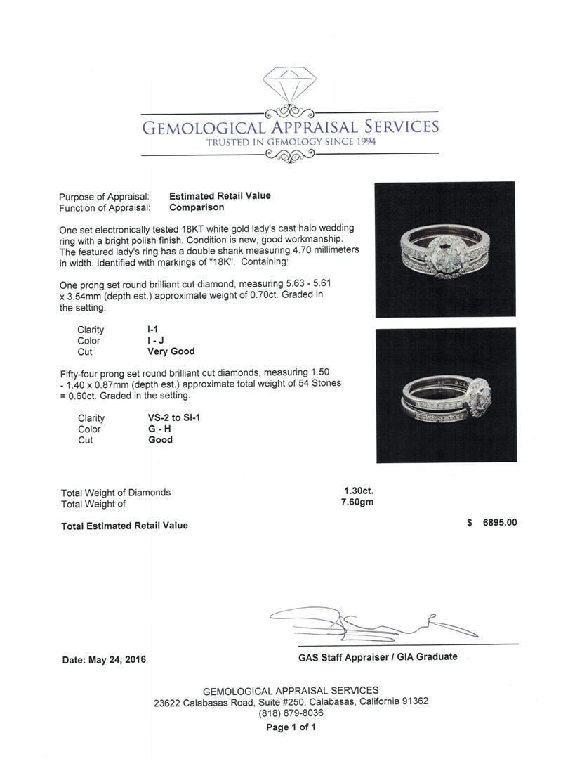 One set electronically tested 18KT white gold lady's cast halo wedding ring with a bright polish finish. The featured lady's ring has a double shank measuring 4.70 millimeters in width. Identified with markings of "18K". Condition is new, good workmanship. Containing: One prong set round brilliant cut diamond, measuring 5.63 - 5.61 x 3.54mm (depth est.) approximate weight of 0.70ct. Graded in the setting. Clarity: I-1. Color: I - Very Good Fifty-Four prong set round brilliant cut diamonds, measuring 1.50 - 1.40 x 0.87mm (depth est.) approximate total weight of 54 Stones = 0.60ct. Graded in the setting. Clarity: VS-2 to SI-1. Color: G - Good. Total Weight of Diamonds 1.30ct. Total Weight of 7.60gm. GAS Appraised at $6,895.00.