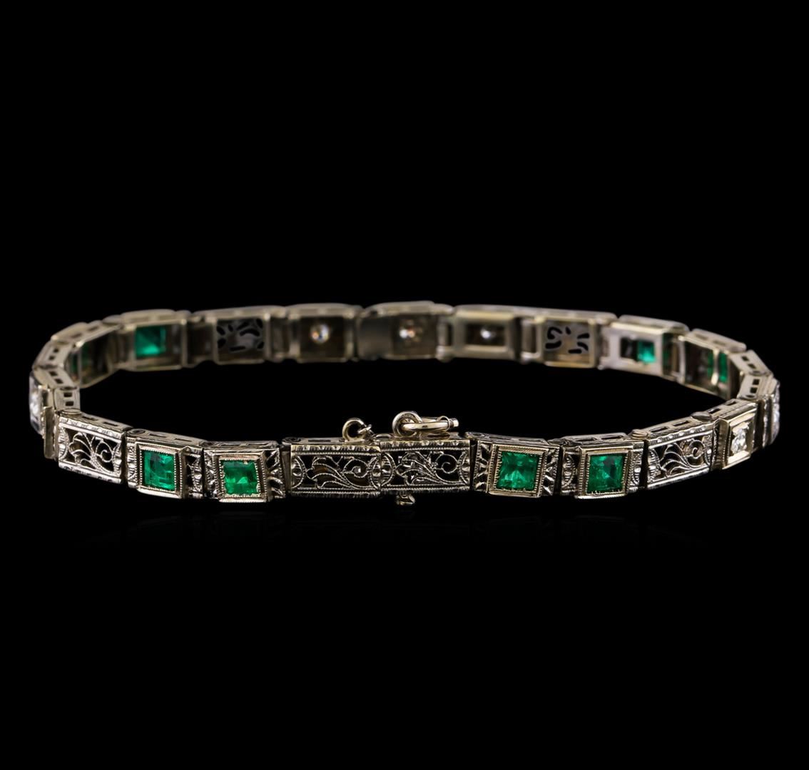 One electronically tested 18KT white gold ladies cast & assembled emerald and diamond bracelet. Seven and one-eighth inch length bracelet features a flexible emerald and diamond ribbon with filagree accented links, terminating in a concealed clasp with safety chain. Bright polish finish with milgrain detailing throughout. Condition is good. Containing: Eight bezel set square step cut natural emeralds, measuring 3.30 x 3.20 x 2.11mm, approximate total weight of 1.30ct., clarity is moderately included, type III, medium dark, very slightly grayish, very slightly bluish green color, (GIA vslbG 6/3), cut is good. Transmitting light with a minimum of distortion, transparent. Naturally occurring internal & external characteristics are present. Measurements & the color grade are an average for the group. Indications of oil residue. Graded in the setting. Seven bead set round brilliant cut diamonds, measuring 2.30 - 2.20 x 1.35mm (depth est.) approximate total weight of 7 Stones = 0.35ct. Graded in the setting. Clarity: SI-1 to SI-2. Color: G - H. Total Weight of Colored Stones 1.30ct. Total Weight of Diamonds 0.35ct. Total Weight of Bracelet 11.69gm. AIG Appraised at $4,550.00.