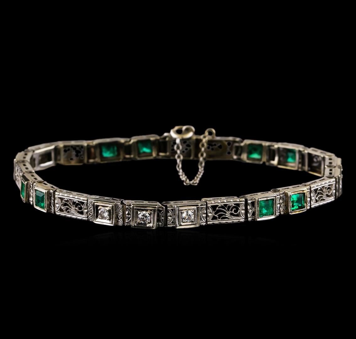 One electronically tested 18KT white gold ladies cast & assembled emerald and diamond bracelet. Seven and one-eighth inch length bracelet features a flexible emerald and diamond ribbon with filagree accented links, terminating in a concealed clasp with safety chain. Bright polish finish with milgrain detailing throughout. Condition is good. Containing: Eight bezel set square step cut natural emeralds, measuring 3.30 x 3.20 x 2.11mm, approximate total weight of 1.30ct., clarity is moderately included, type III, medium dark, very slightly grayish, very slightly bluish green color, (GIA vslbG 6/3), cut is good. Transmitting light with a minimum of distortion, transparent. Naturally occurring internal & external characteristics are present. Measurements & the color grade are an average for the group. Indications of oil residue. Graded in the setting. Seven bead set round brilliant cut diamonds, measuring 2.30 - 2.20 x 1.35mm (depth est.) approximate total weight of 7 Stones = 0.35ct. Graded in the setting. Clarity: SI-1 to SI-2. Color: G - H. Total Weight of Colored Stones 1.30ct. Total Weight of Diamonds 0.35ct. Total Weight of Bracelet 11.69gm. AIG Appraised at $4,550.00.
