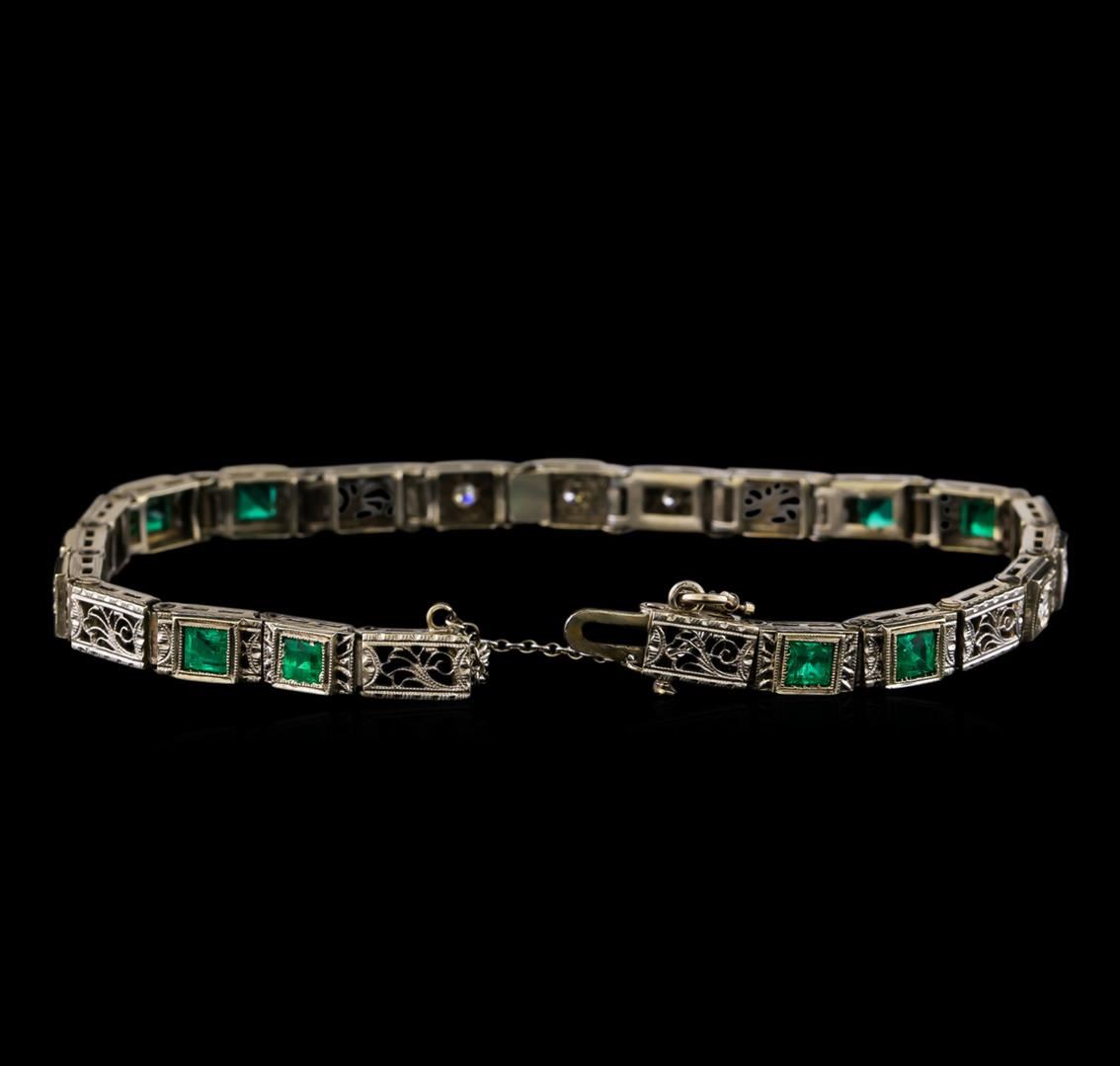 One electronically tested 18KT white gold ladies cast & assembled emerald and diamond bracelet. Seven and one-eighth inch length bracelet features a flexible emerald and diamond ribbon with filagree accented links, terminating in a concealed clasp with safety chain. Bright polish finish with milgrain detailing throughout. Condition is good. Containing: Eight bezel set square step cut natural emeralds, measuring 3.30 x 3.20 x 2.11mm, approximate total weight of 1.30ct., clarity is moderately included, type III, medium dark, very slightly grayish, very slightly bluish green color, (GIA vslbG 6/3), cut is good. Transmitting light with a minimum of distortion, transparent. Naturally occurring internal & external characteristics are present. Measurements & the color grade are an average for the group. Indications of oil residue. Graded in the setting. Seven bead set round brilliant cut diamonds, measuring 2.30 - 2.20 x 1.35mm (depth est.) approximate total weight of 7 Stones = 0.35ct. Graded in the setting. Clarity: SI-1 to SI-2. Color: G - H. Total Weight of Colored Stones 1.30ct. Total Weight of Diamonds 0.35ct. Total Weight of Bracelet 11.69gm. AIG Appraised at $4,550.00.
