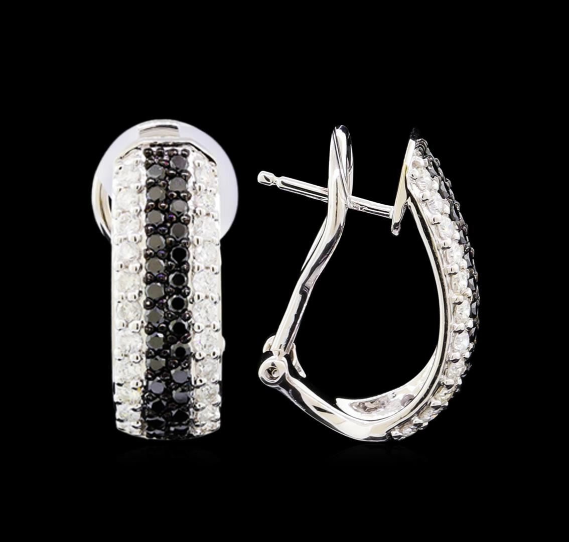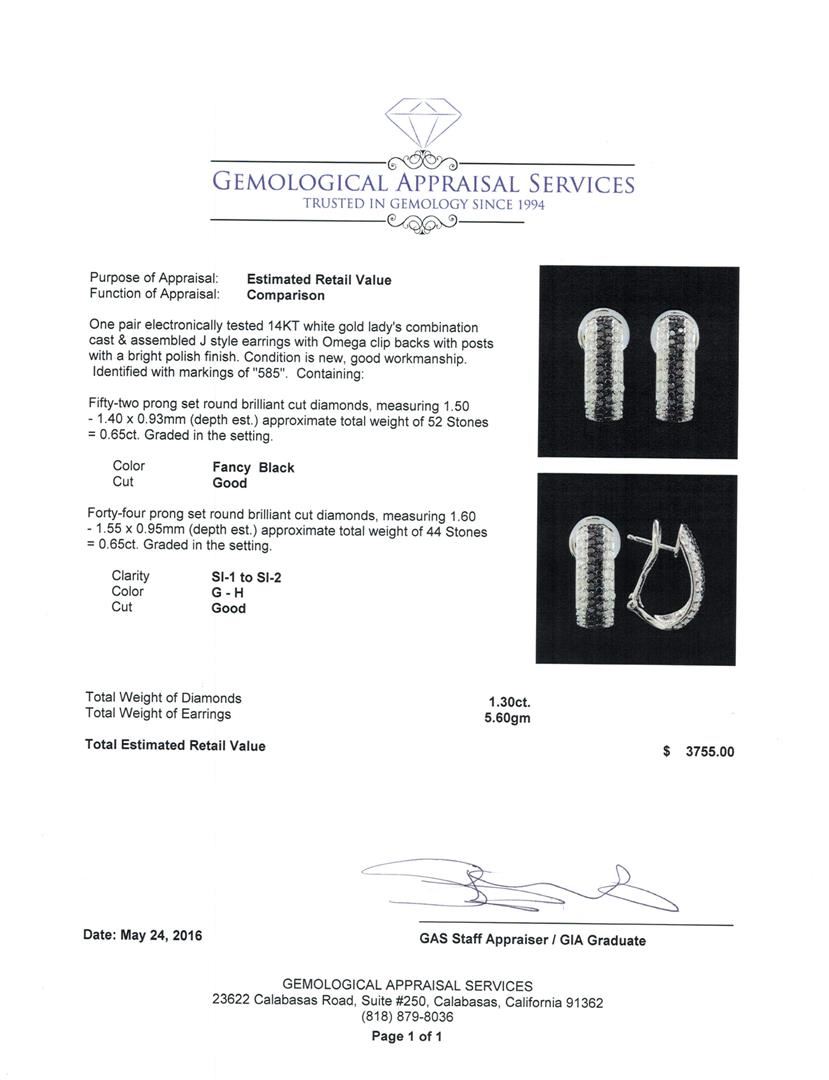 One pair electronically tested 14KT white gold lady's combination cast & assembled J style earrings with Omega clip backs with posts with a bright polish finish. Identified with markings of "585". Condition is new, good workmanship. Containing: Fifty-Two prong set round brilliant cut diamonds, measuring 1.50 - 1.40 x 0.93mm (depth est.) approximate total weight of 52 Stones = 0.65ct. Graded in the setting. Cut Good Forty-Four prong set round brilliant cut diamonds, measuring 1.60 - 1.55 x 0.95mm (depth est.) approximate total weight of 44 Stones = 0.65ct. Graded in the setting. Clarity: SI-1 to SI-2. Color: G - Good. Total Weight of Diamonds 1.30ct. Total Weight of Earrings 5.60gm. GAS Appraised at $3,755.00.