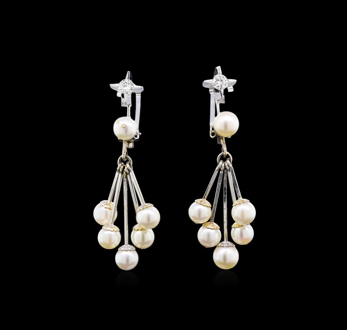 One 14KT white gold 6mm pearl and diamond earrings. Metal: 14KT solid white gold. Face Measurements: 14 x 51mm. Finish: Bright polish. Total Item Weight: 10.0 grams. Markings: Stamped 14K. Containing: 12 round pearls measuring 6mm. Setting: Pin. Type: South Sea. Shape: Round. Color: White. Luster: High. Nacre: Thick. Quality: AA+. The pearls are complemented by 2 round Diamonds with a total weight of 1.30ct. Measurements: 4mm. Treatment: None. Setting: Channel. Color Grade: G - H. Clarity Grade: VS1 - VS2. Cut: Very good. Excellent workmanship. Pearls graded in the setting. BHGL Appraised at $5,600.00.