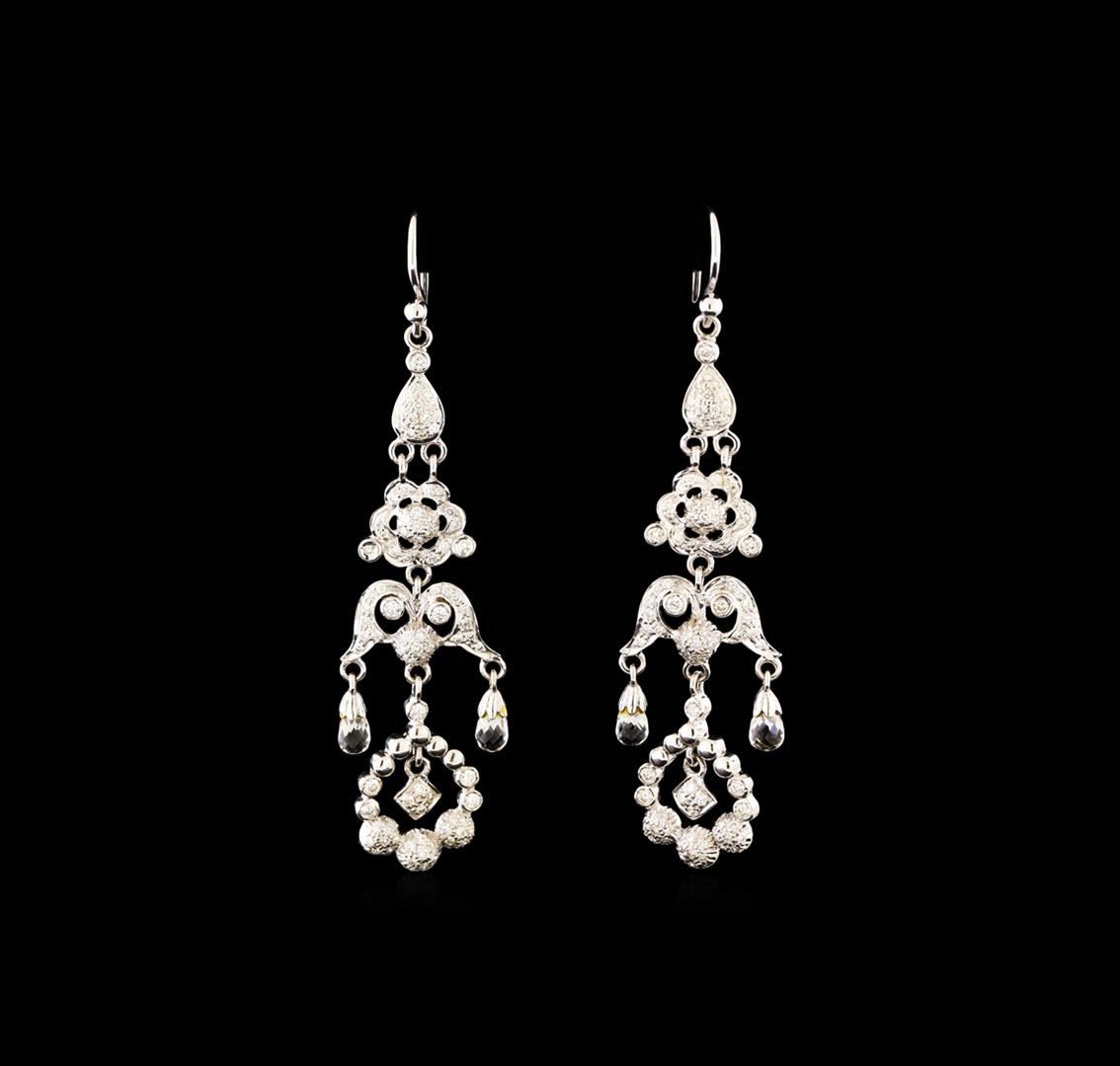 One pair electronically tested 18KT white gold ladies cast & assembled diamond and quartz chandelier style earrings with French hooks. Each earring is two and three-quarter inches in length. Bright polish finish. Condition is good. Containing: One Hundred Seventy-Six bead & bezel set round brilliant cut diamonds, measuring 1.70 - 1.00 x 0.81mm (depth est.) approximate total weight of 176 Stones = 1.56ct. Clarity VS-1 to VS-2. Color: G - I Four briolette mixed cut natural quartz's, measuring 4.80 x 3.40 x 3.40mm, approximate total weight of 1.30ct., clarity is eye clean, colorless, very slightly grayish, white color, (GIA W 0/3), cut is good. Transmitting light somewhat diffusely, translucent. Measurements & the color grade are an average for the group. Graded in the setting. Total Weight of Colored Stones 1.30ct.. Total Weight of Diamonds 1.56ct.. Total Weight of Earrings 11.15gm. AIG Appraised at $8,750.00.