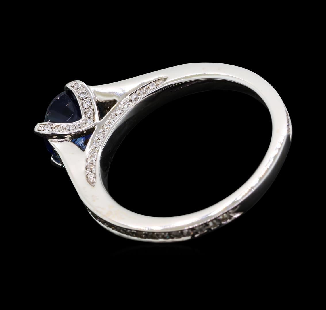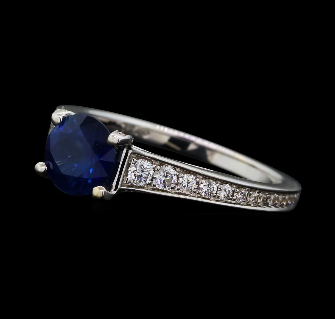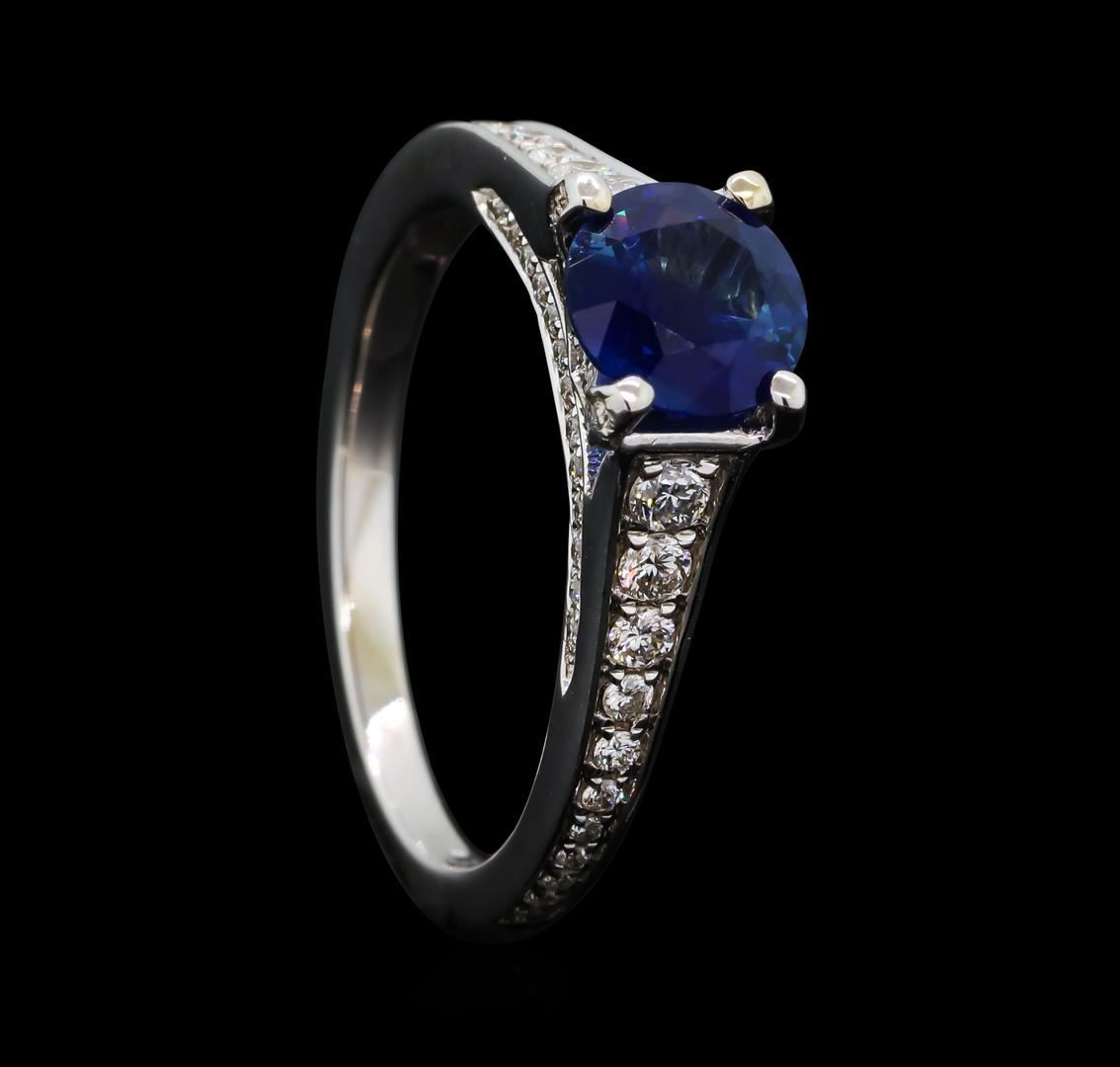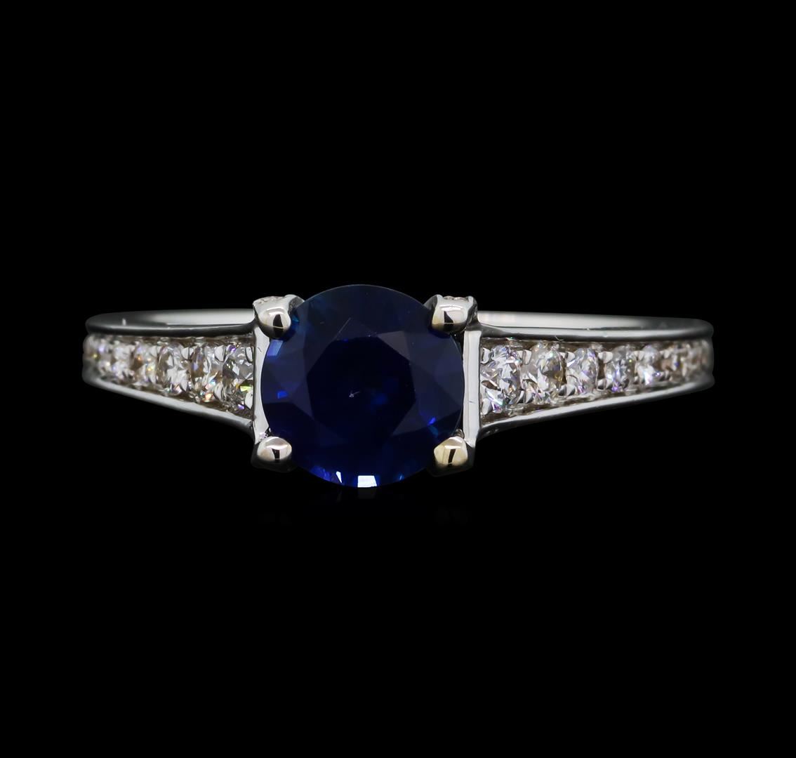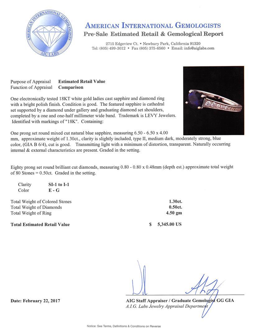 One electronically tested 18KT white gold ladies cast sapphire and diamond ring with a bright polish finish. The featured sapphire is cathedral set supported by a diamond under gallery and graduating diamond set shoulders, completed by a one and one-half millimeter wide band. Trademark is LEVY Jewelers. Identified with markings of '18K'. Condition is good. Containing: One prong set round mixed cut natural blue sapphire, measuring 6.50 - 6.50 x 4.00 mm, approximate weight of 1.30ct., clarity is slightly included, type II, medium dark, moderately strong, blue color, (GIA B 6/4), cut is good. Transmitting light with a minimum of distortion, transparent. Naturally occurring internal & external characteristics are present. Graded in the setting. Eighty prong set round brilliant cut diamonds, measuring 0.80 - 0.80 x 0.48mm (depth est.) approximate total weight of 80 Stones = 0.50ct. Graded in the setting. Clarity SI-1 to I-1. Color: E - G. Total Weight of Colored Stones 1.30ct.. Total Weight of Diamonds 0.50ct.. Total Weight of Ring 4.50gm. AIG Appraised at $5,345.00.
