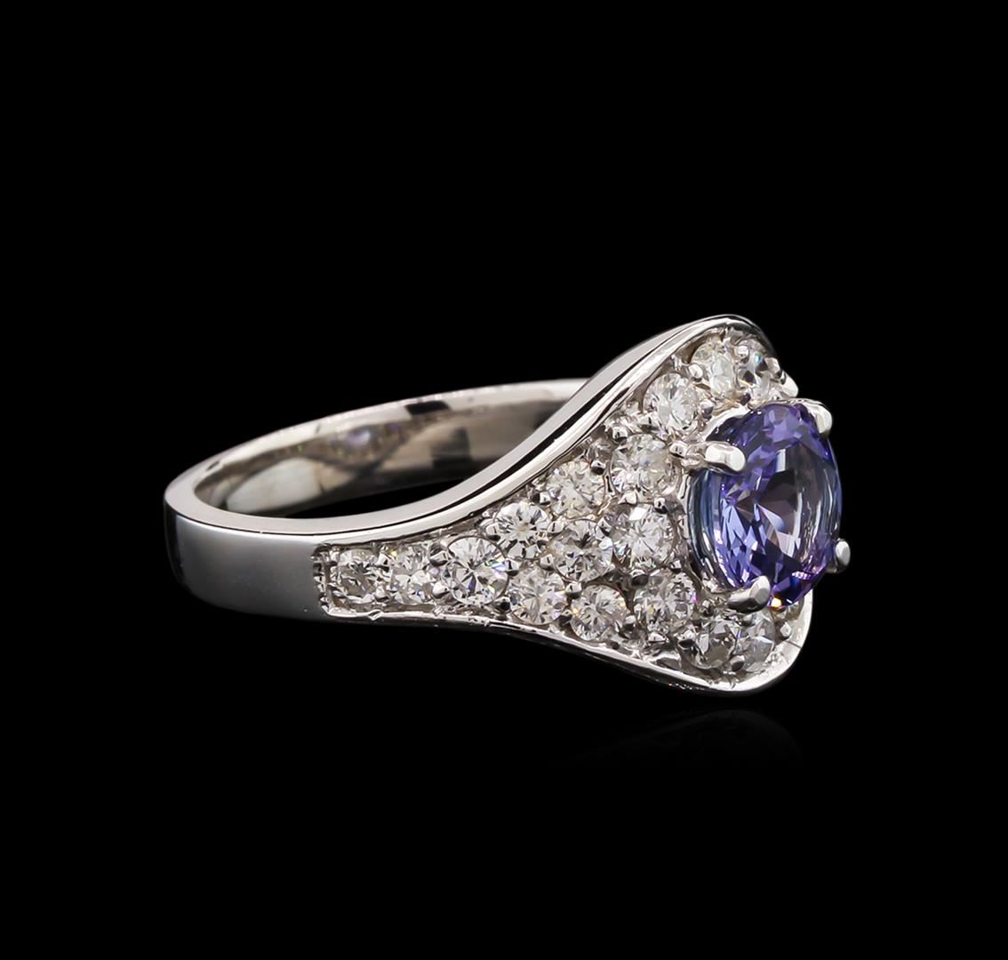 One electronically tested 14KT white gold lady's cast fashion ring with a bright polish finish. The featured lady's ring has a shank measuring 3.27 millimeters wide. Identified with markings of "K14". Condition is new, good workmanship. Containing: One prong set round modified brilliant cut natural tanzanite, measuring 6.99 - 6.91 x 3.94 mm, approximate weight of 1.30ct., clarity is eye clean, type I, medium, very slightly grayish, bluish violet color, (GIA bV 5/3), cut is very good. Transmitting light with no distortion, transparent. Colored gemstones are presumed to have been subjected to commonly used enhancement processes. Graded in the setting. Twenty-Eight prong set round brilliant cut diamonds, measuring 2.40 - 2.10 x 1.35mm (depth est.) approximate total weight of 28 Stones = 1.12ct. Graded in the setting. Clarity: SI-1 to I-1. Color: H - Good. Total Weight of Colored Stones 1.30ct. Total Weight of Diamonds 1.12ct. Total Weight of Ring 7.10gm. GAS Appraised at $5,865.00.