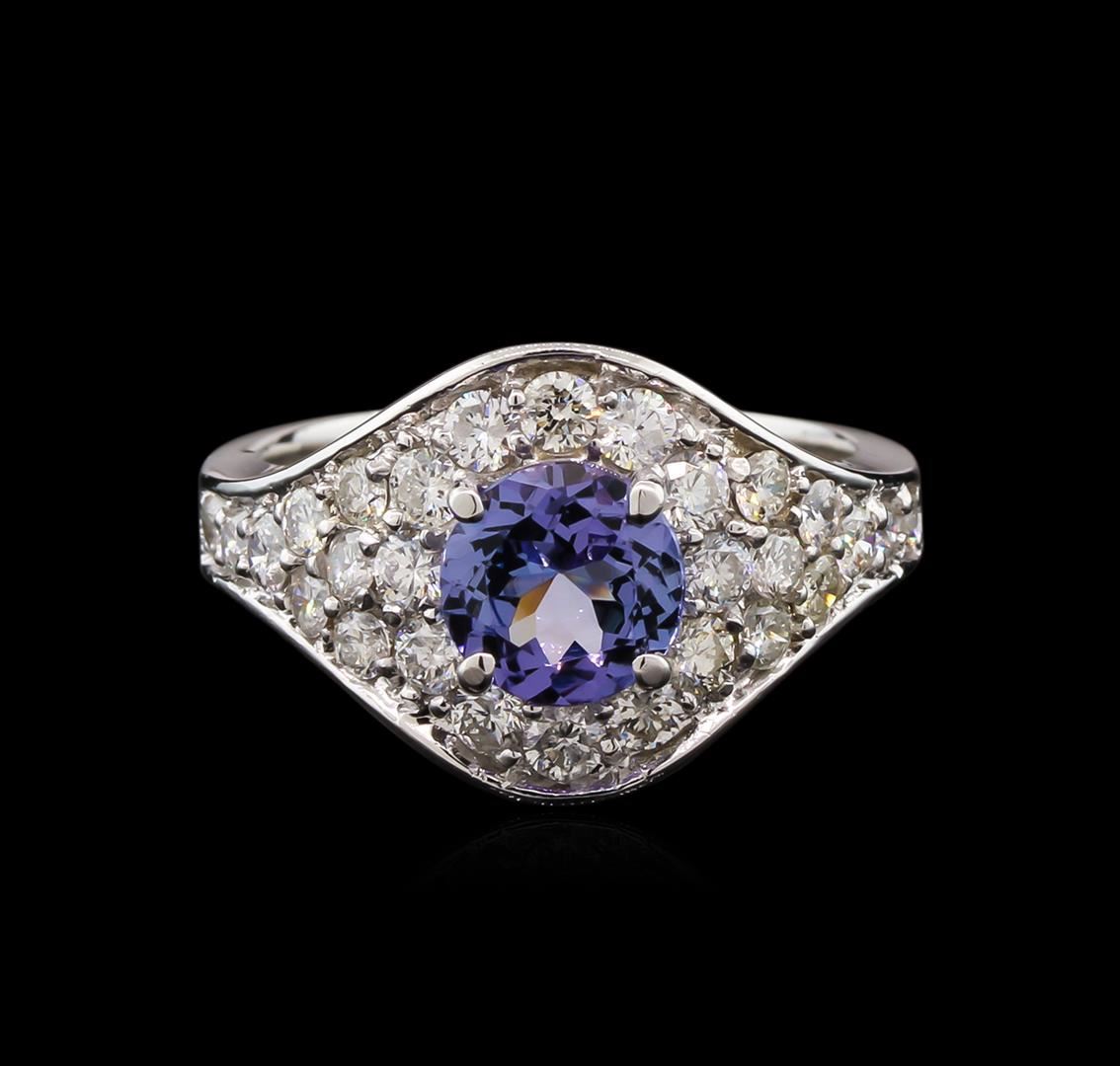 One electronically tested 14KT white gold lady's cast fashion ring with a bright polish finish. The featured lady's ring has a shank measuring 3.27 millimeters wide. Identified with markings of "K14". Condition is new, good workmanship. Containing: One prong set round modified brilliant cut natural tanzanite, measuring 6.99 - 6.91 x 3.94 mm, approximate weight of 1.30ct., clarity is eye clean, type I, medium, very slightly grayish, bluish violet color, (GIA bV 5/3), cut is very good. Transmitting light with no distortion, transparent. Colored gemstones are presumed to have been subjected to commonly used enhancement processes. Graded in the setting. Twenty-Eight prong set round brilliant cut diamonds, measuring 2.40 - 2.10 x 1.35mm (depth est.) approximate total weight of 28 Stones = 1.12ct. Graded in the setting. Clarity: SI-1 to I-1. Color: H - Good. Total Weight of Colored Stones 1.30ct. Total Weight of Diamonds 1.12ct. Total Weight of Ring 7.10gm. GAS Appraised at $5,865.00.