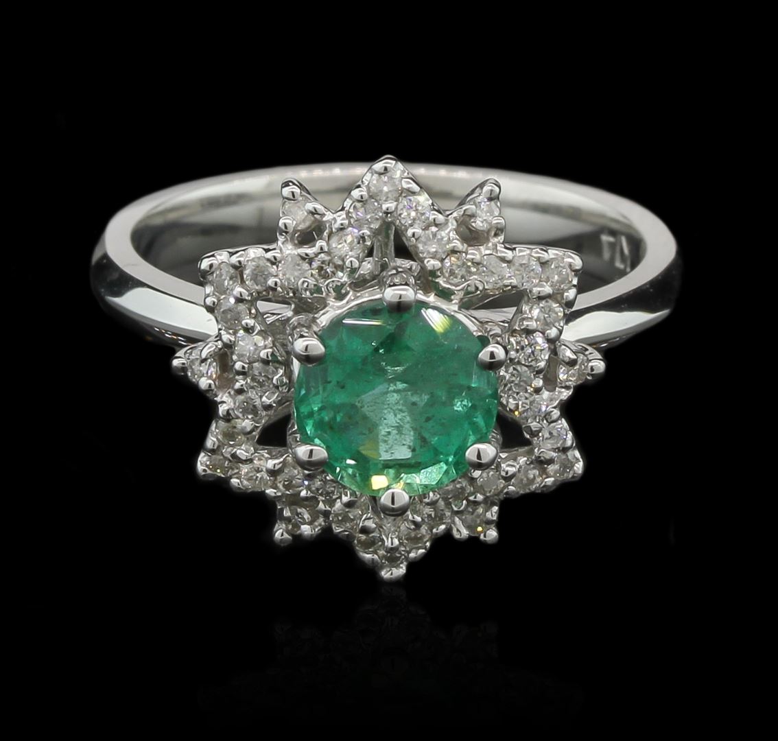 One electronically tested 14KT white gold lady's cast fashion ring with a knife edge shank with a bright polish finish. The featured lady's ring has a star motif with a 2.75 millimeter wide shank. Identified with markings of "K14". Condition is new, good workmanship. Containing: One prong set round standard brilliant cut natural emerald, measuring 6.60 - 6.55 x 5.11 mm, 5% bulge factor, approximate weight of 1.30ct., clarity is slightly included, type III, medium dark, strong, green color, (GIA G 6/5), cut is good. Colored gemstones are presumed to have been subjected to commonly used enhancement processes. Graded in the setting. Forty-Two prong set round brilliant cut diamonds, measuring 1.20 - 1.10 x 0.75mm (depth est.) approximate total weight of 42 Stones = 0.26ct. Graded in the setting. Clarity: SI-1 to I-1. Color: H - I. Cut Good. Total Weight of Colored Stones 1.30ct. Total Weight of Diamonds 0.26ct. Total Weight of Ring 4.20gm. GAS Appraised at $3,375.00.