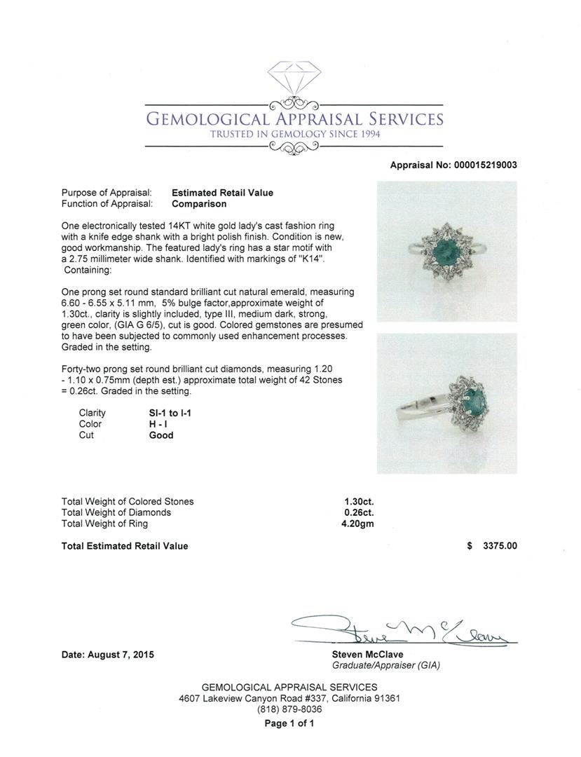 One electronically tested 14KT white gold lady's cast fashion ring with a knife edge shank with a bright polish finish. The featured lady's ring has a star motif with a 2.75 millimeter wide shank. Identified with markings of "K14". Condition is new, good workmanship. Containing: One prong set round standard brilliant cut natural emerald, measuring 6.60 - 6.55 x 5.11 mm, 5% bulge factor, approximate weight of 1.30ct., clarity is slightly included, type III, medium dark, strong, green color, (GIA G 6/5), cut is good. Colored gemstones are presumed to have been subjected to commonly used enhancement processes. Graded in the setting. Forty-Two prong set round brilliant cut diamonds, measuring 1.20 - 1.10 x 0.75mm (depth est.) approximate total weight of 42 Stones = 0.26ct. Graded in the setting. Clarity: SI-1 to I-1. Color: H - I. Cut Good. Total Weight of Colored Stones 1.30ct. Total Weight of Diamonds 0.26ct. Total Weight of Ring 4.20gm. GAS Appraised at $3,375.00.