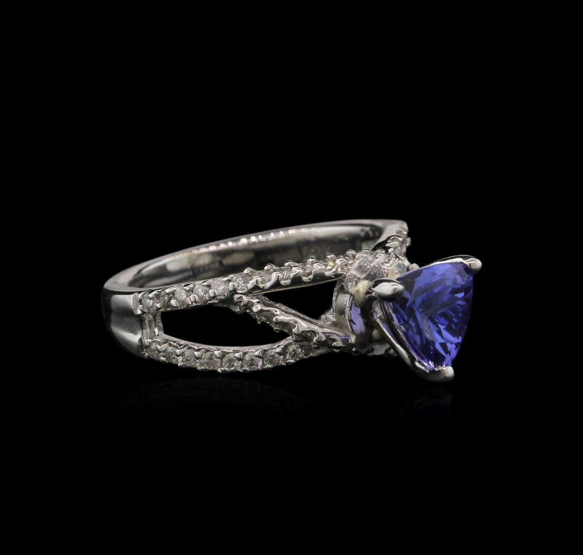 One ring featuring: 14KT white gold weighing 4.65 grams containing one prong set pyramid shape tanzanite center stone with a total weight of 1.30ct and pave set round diamonds with a total weight of 0.42ct.