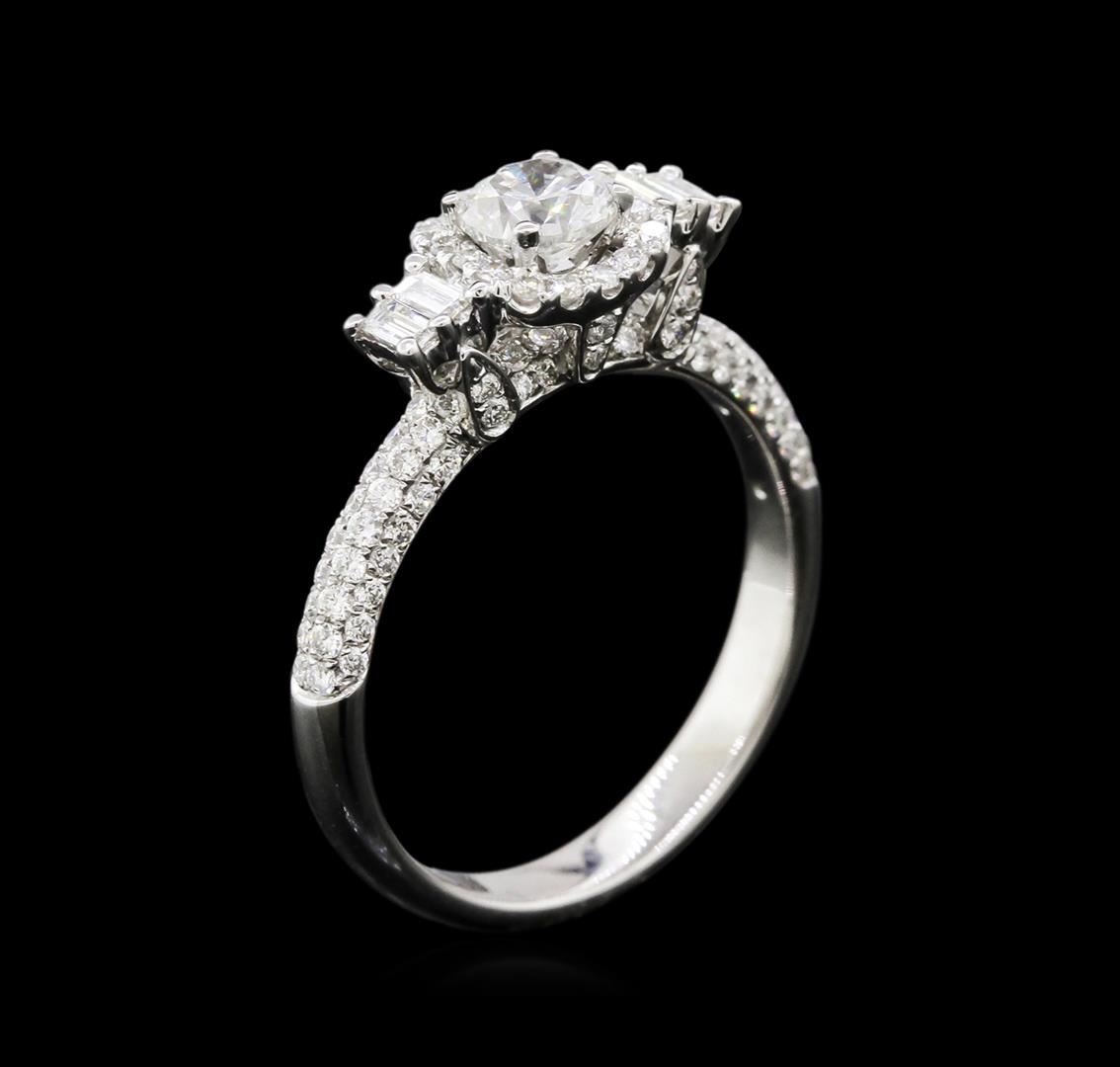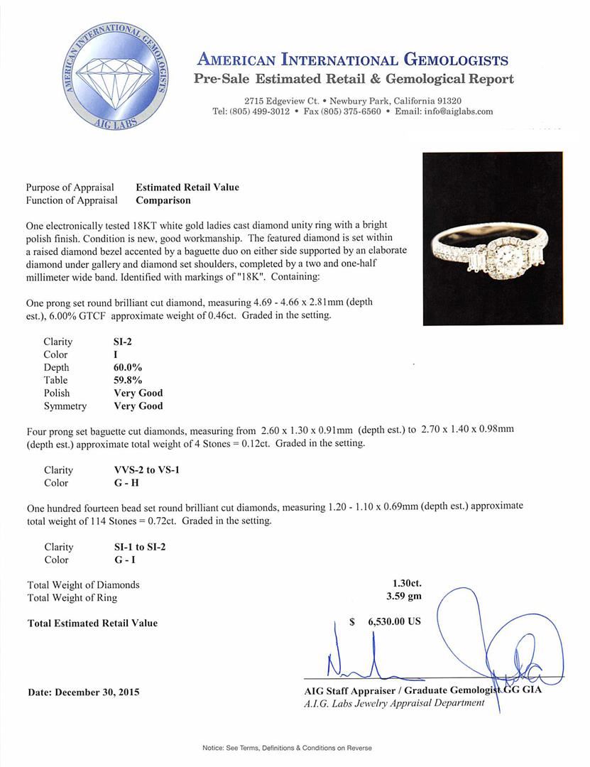 One electronically tested 18KT white gold ladies cast diamond unity ring with a bright polish finish. The featured diamond is set within a raised diamond bezel accented by a baguette duo on either side supported by an elaborate diamond under gallery and diamond set shoulders, completed by a two and one-half millimeter wide band. Identified with markings of "18K". Condition is new, good workmanship. Containing: One prong set round brilliant cut diamond, measuring 4.69 - 4.66 x 2.81mm (depth est.), 6.00.%. GTCF approximate weight of 0.46ct. Graded in the setting. Clarity: SI-2. Color: I. Depth 60.0%. Table 59.8%. Four prong set baguette cut diamonds, measuring from 2.60 x 1.30 x 0.91mm (depth est.) to 2.70 x 1.40 x 0.98mm (depth est.) approximate total weight of 4 Stones = 0.12ct. Graded in the setting. Clarity: VVS-2 to VS-1. Color: G - H One Hundred Fourteen bead set round brilliant cut diamonds, measuring 1.20 - 1.10 x 0.69mm (depth est.) approximate total weight of 114 Stones = 0.72ct. Graded in the setting. Clarity: SI-1 to SI-2. Color: G - I. Total Weight of Diamonds 1.30ct. Total Weight of Ring 3.59gm. AIG Appraised at $6,530.00.
