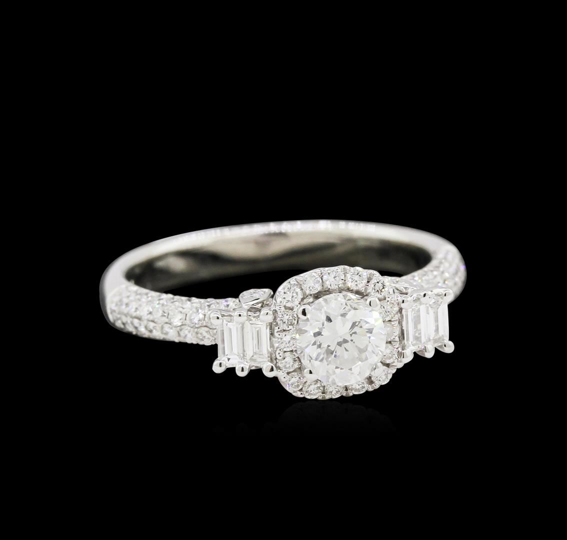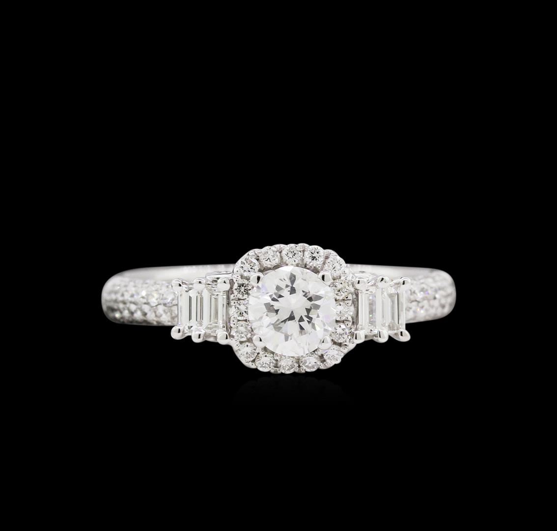 One electronically tested 18KT white gold ladies cast diamond unity ring with a bright polish finish. The featured diamond is set within a raised diamond bezel accented by a baguette duo on either side supported by an elaborate diamond under gallery and diamond set shoulders, completed by a two and one-half millimeter wide band. Identified with markings of "18K". Condition is new, good workmanship. Containing: One prong set round brilliant cut diamond, measuring 4.69 - 4.66 x 2.81mm (depth est.), 6.00.%. GTCF approximate weight of 0.46ct. Graded in the setting. Clarity: SI-2. Color: I. Depth 60.0%. Table 59.8%. Four prong set baguette cut diamonds, measuring from 2.60 x 1.30 x 0.91mm (depth est.) to 2.70 x 1.40 x 0.98mm (depth est.) approximate total weight of 4 Stones = 0.12ct. Graded in the setting. Clarity: VVS-2 to VS-1. Color: G - H One Hundred Fourteen bead set round brilliant cut diamonds, measuring 1.20 - 1.10 x 0.69mm (depth est.) approximate total weight of 114 Stones = 0.72ct. Graded in the setting. Clarity: SI-1 to SI-2. Color: G - I. Total Weight of Diamonds 1.30ct. Total Weight of Ring 3.59gm. AIG Appraised at $6,530.00.