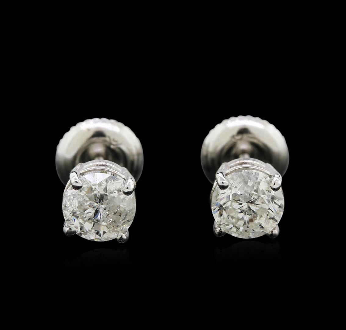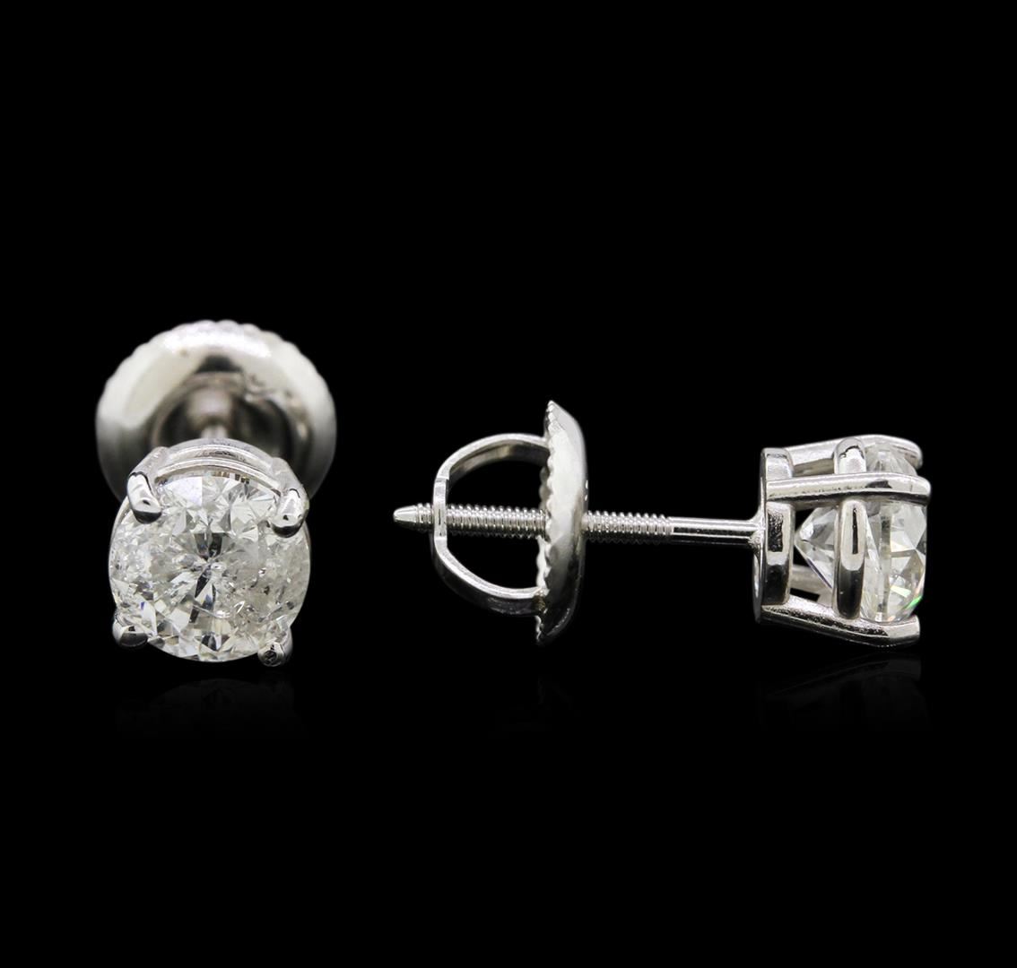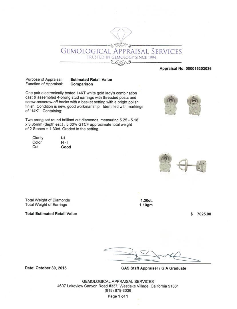 One pair electronically tested 14KT white gold lady's combination cast & assembled 4-prong stud earrings with threaded posts and screw-on/screw-off backs with a basket setting with a bright polish finish. Identified with markings of "14K". Condition is new, good workmanship. Containing: Two prong set round brilliant cut diamonds, measuring 5.25 - 5.18 x 3.65mm (depth est.) , 5.00% GTCF approximate total weight of 2 Stones = 1.30ct. Graded in the setting. Clarity: I-1. Color: H - I. Cut Good. Total Weight of Diamonds 1.30ct. Total Weight of Earrings 1.10gm. GAS Appraised.
