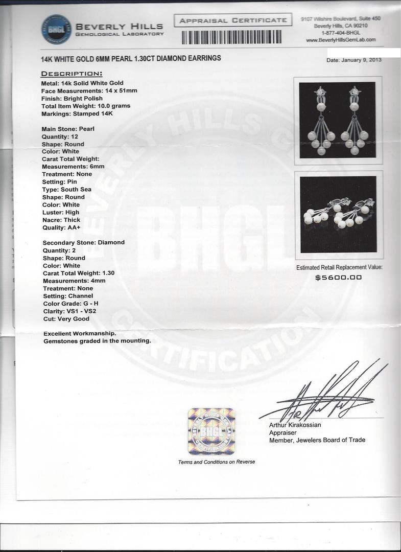 One 14KT white gold 6mm pearl and diamond earrings. Metal: 14KT solid white gold. Face Measurements: 14 x 51mm. Finish: Bright polish. Total Item Weight: 10.0 grams. Markings: Stamped 14K. Containing: 12 round pearls measuring 6mm. Setting: Pin. Type: South Sea. Shape: Round. Color: White. Luster: High. Nacre: Thick. Quality: AA+. The pearls are complemented by 2 round Diamonds with a total weight of 1.30ct. Measurements: 4mm. Treatment: None. Setting: Channel. Color Grade: G - H. Clarity Grade: VS1 - VS2. Cut: Very good. Excellent workmanship. Pearls graded in the setting. BHGL Appraised at $5,600.00.