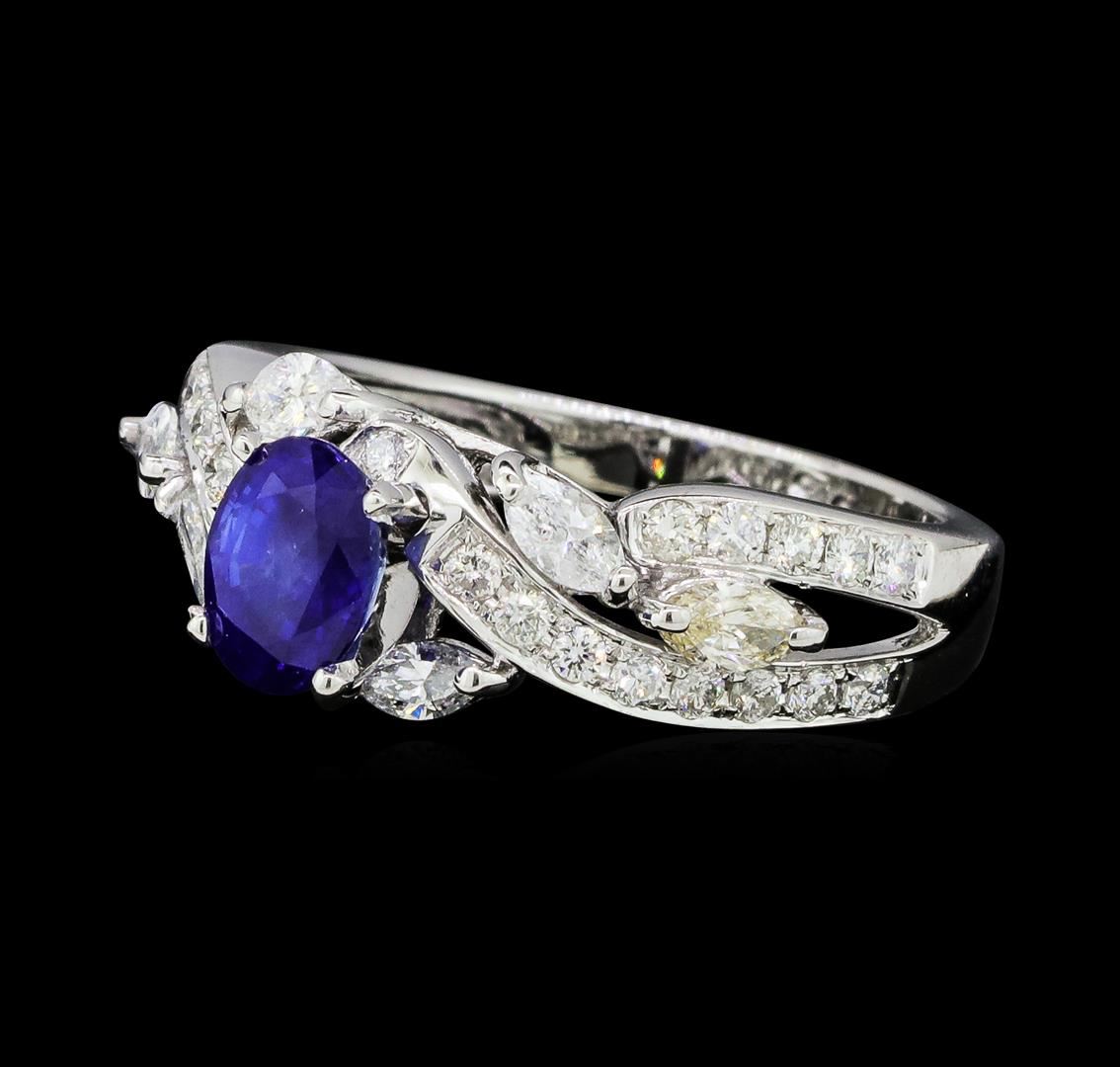 One electronically tested 14KT white gold lady's cast fashion ring with a split crossover shank with a bright polish finish. The featured lady's ring has a shank measuring 2.60 millimeters wide. Identified with markings of '14K'. Condition is new, good workmanship. Containing: One prong set oval modified mixed cut natural blue sapphire, measuring 6.98 x 5.13 x 4.20mm, (depth est.) 5%. bulge factor, approximate weight of 1.31ct., clarity is slightly included, medium dark, strong, blue color, (GIA B 6/5), cut is good. Transmitting light with a minimum of distortion, transparent. Colored gemstones are presumed to have been subjected to commonly used enhancement processes. Graded in the setting. Six prong set marquise shaped cut diamonds, measuring 4.10 x 2.30 x 1.45mm (depth est.) approximate total weight of 6 Stones = 0.48ct. Graded in the setting. Color H - K Clarity SI-1 to I-1 Cut Good Twenty-Eight prong set round brilliant cut diamonds, measuring 1.70 - 1.65 x 1.04mm (depth est.) approximate total weight of 28 Stones = 0.52ct. Graded in the setting. Color H - I Clarity SI-1 to I-1 Cut Good. Total Weight of Colored Stones 1.31ct.. Total Weight of Diamonds 1.00ct.. Total Weight of Ring 4.90gm GAS Appraised at $5280.00. GAS Appraised at $5,280.00.