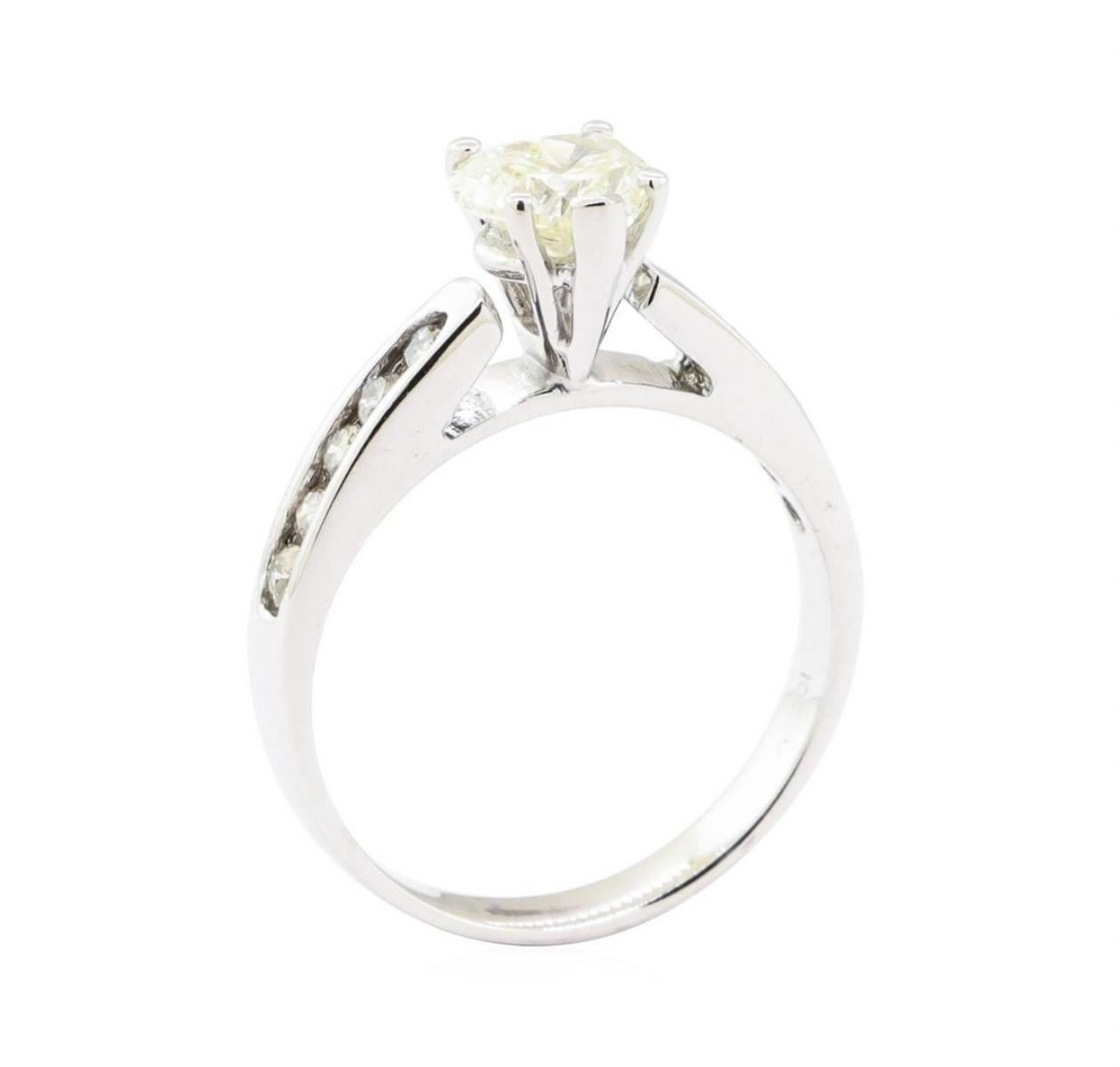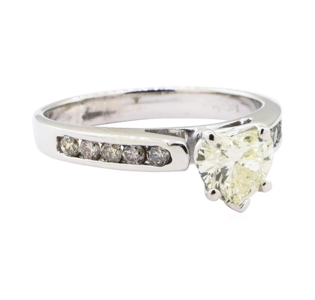 One electronically tested 10KT white gold lady's combination cast & assembled wedding ring with a cathedral channel with a bright polish finish. The featured lady's ring has a shank measuring 2.80 millimeters wide. Identified with markings of '10K'. Condition is new, good workmanship. Containing: One prong set heart shaped cut diamond, measuring 6.78 x 6.10 x 3.90mm (depth est.) approximate weight of 1.01ct. Graded in the setting. Color L - M Clarity I-1 Cut Good Ten channel set round brilliant cut diamonds, measuring 2.00 - 1.95 x 1.23mm (depth est.) approximate total weight of 10 Stones = 0.30 ct. Graded in the setting. Color J - L Clarity SI-2 to I-1 Cut Good. Total Weight of Diamonds 1.31ct.. Total Weight of Ring 3.40gm GAS Appraised at $4325.00. GAS Appraised.
