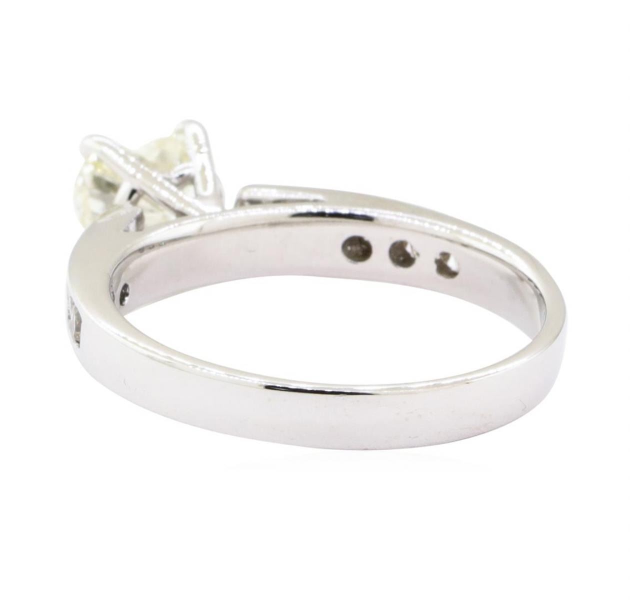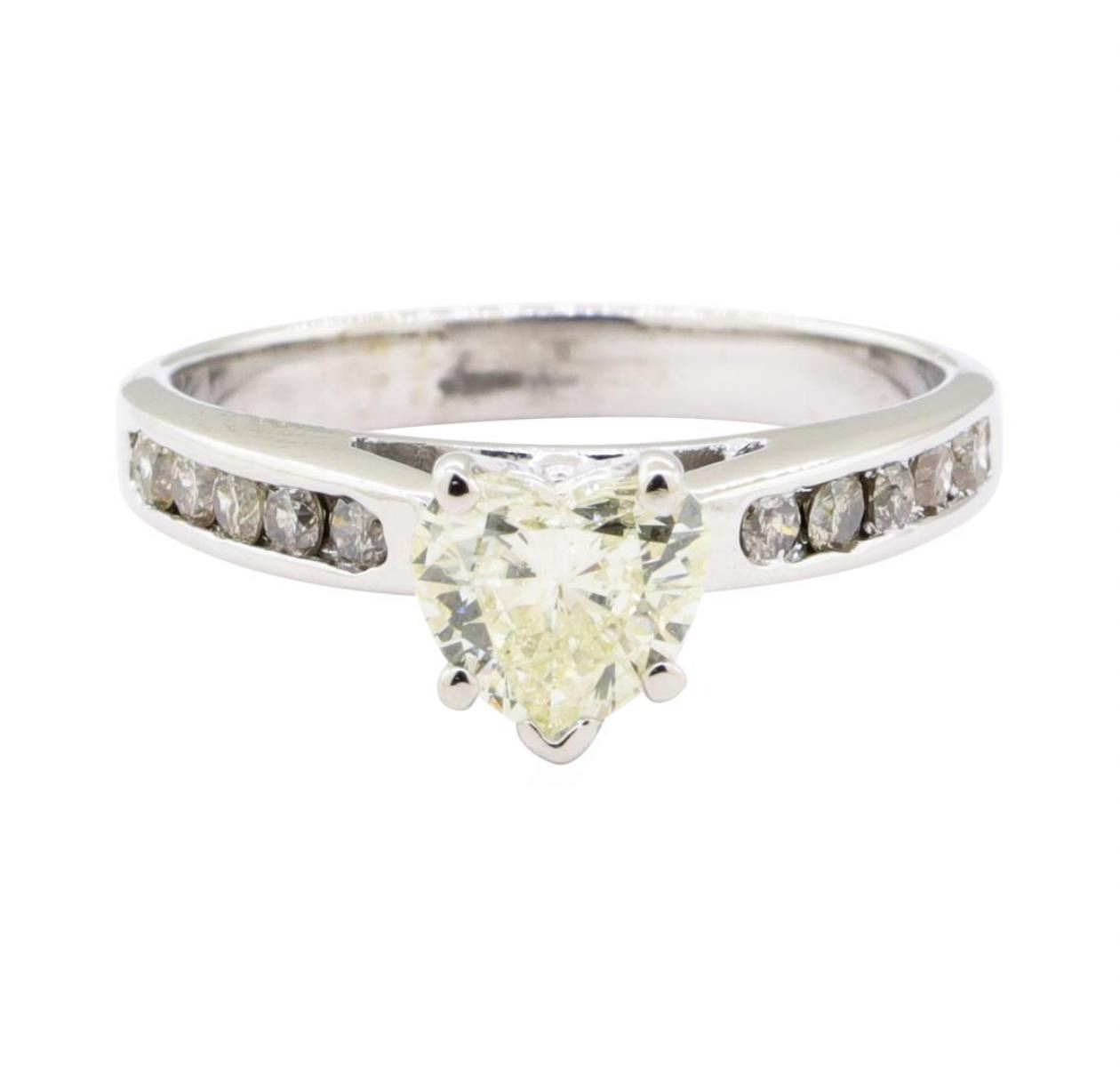 One electronically tested 10KT white gold lady's combination cast & assembled wedding ring with a cathedral channel with a bright polish finish. The featured lady's ring has a shank measuring 2.80 millimeters wide. Identified with markings of '10K'. Condition is new, good workmanship. Containing: One prong set heart shaped cut diamond, measuring 6.78 x 6.10 x 3.90mm (depth est.) approximate weight of 1.01ct. Graded in the setting. Color L - M Clarity I-1 Cut Good Ten channel set round brilliant cut diamonds, measuring 2.00 - 1.95 x 1.23mm (depth est.) approximate total weight of 10 Stones = 0.30 ct. Graded in the setting. Color J - L Clarity SI-2 to I-1 Cut Good. Total Weight of Diamonds 1.31ct.. Total Weight of Ring 3.40gm GAS Appraised at $4325.00. GAS Appraised.
