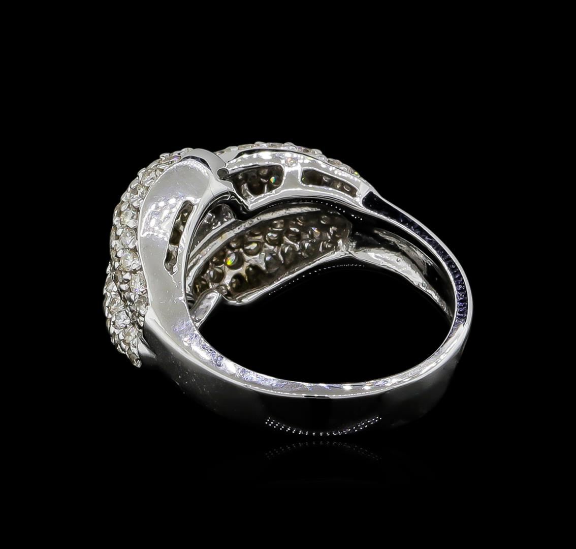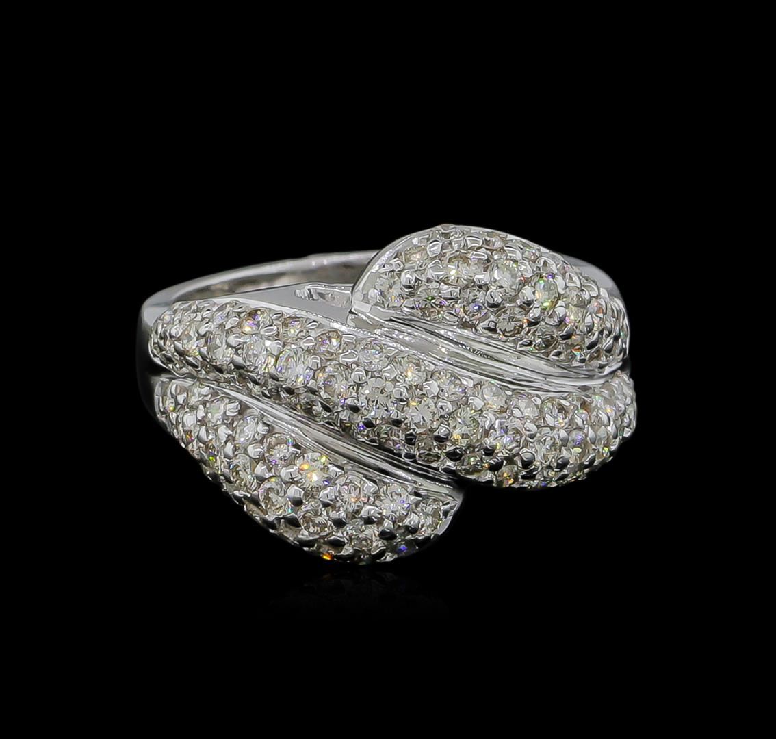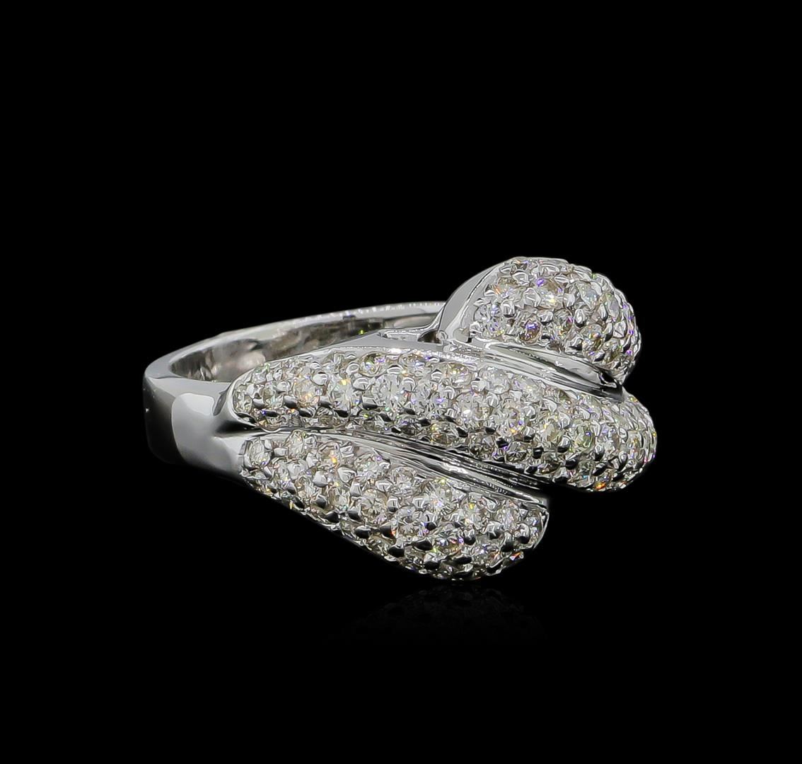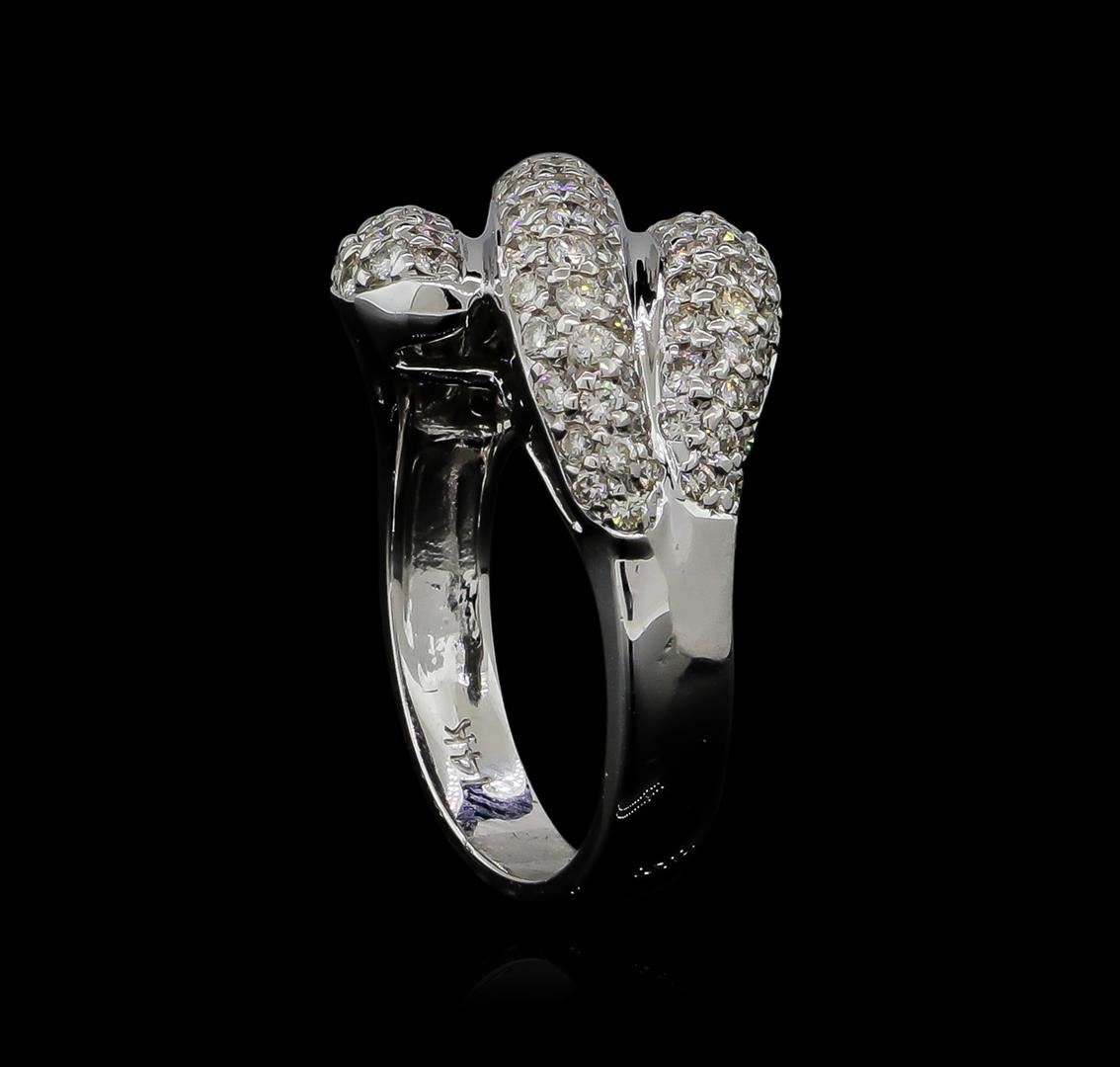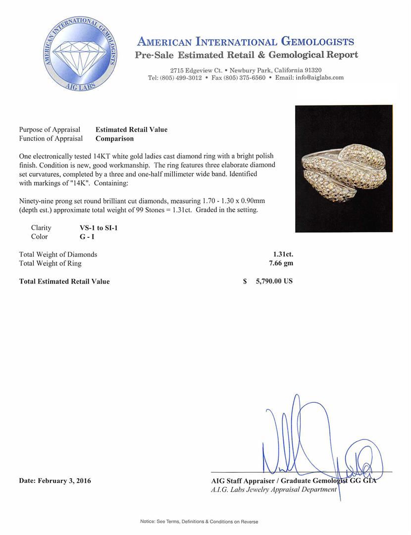 One electronically tested 14KT white gold ladies cast diamond ring with a bright polish finish. The ring features three elaborate diamond set curvatures, completed by a three and one-half millimeter wide band. Identified with markings of "14K". Condition is new, good workmanship. Containing: Ninety-Nine prong set round brilliant cut diamonds, measuring 1.70 - 1.30 x 0.90mm (depth est.) approximate total weight of 99 Stones = 1.31ct. Graded in the setting. Clarity: VS-1 to SI-1. Color: G - I. Total Weight of Diamonds 1.31ct. Total Weight of Ring 7.66gm. AIG Appraised at $5,790.00.