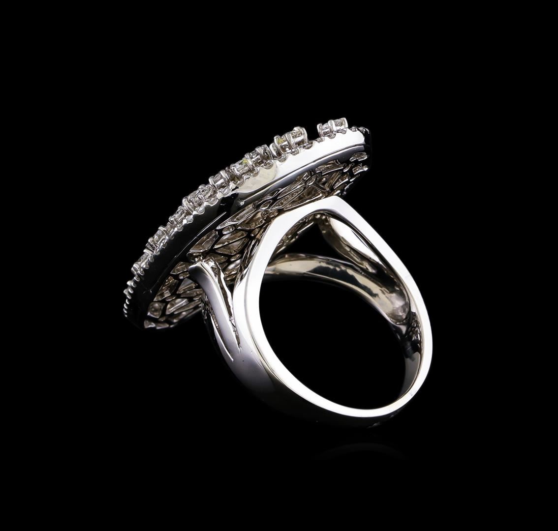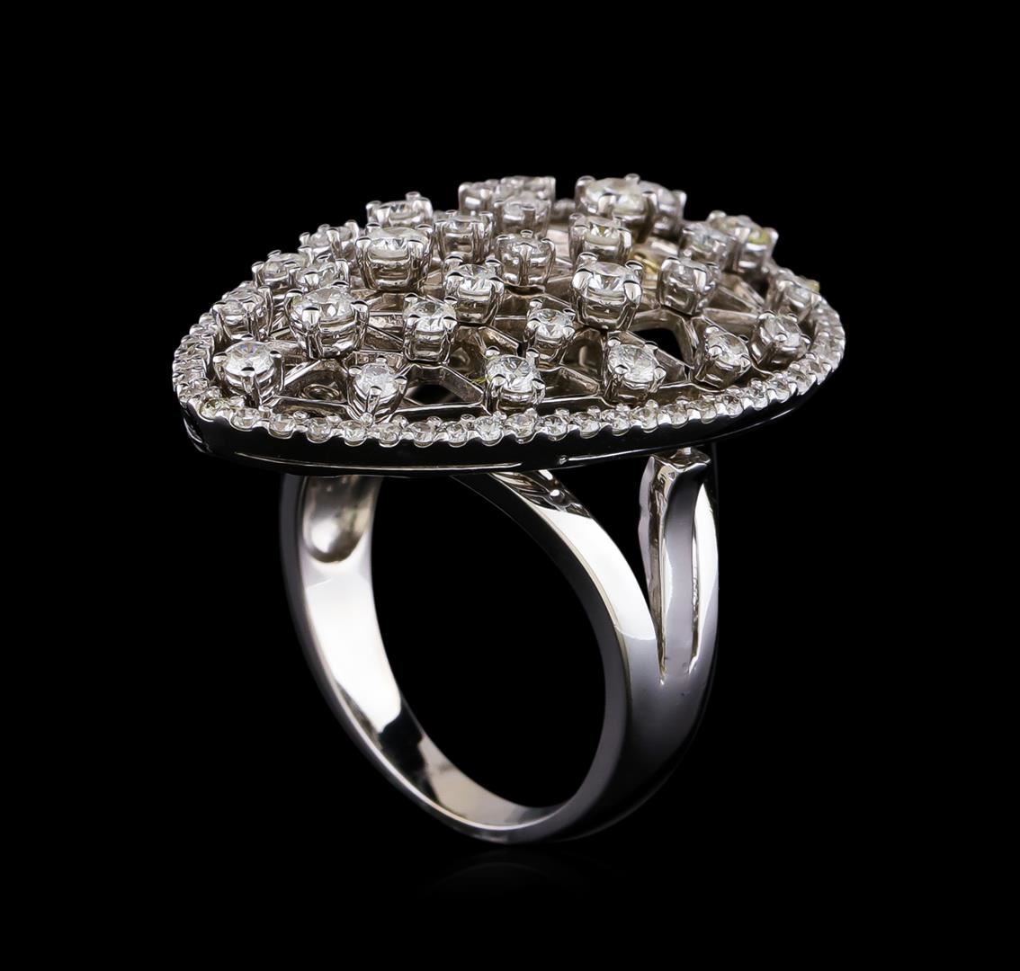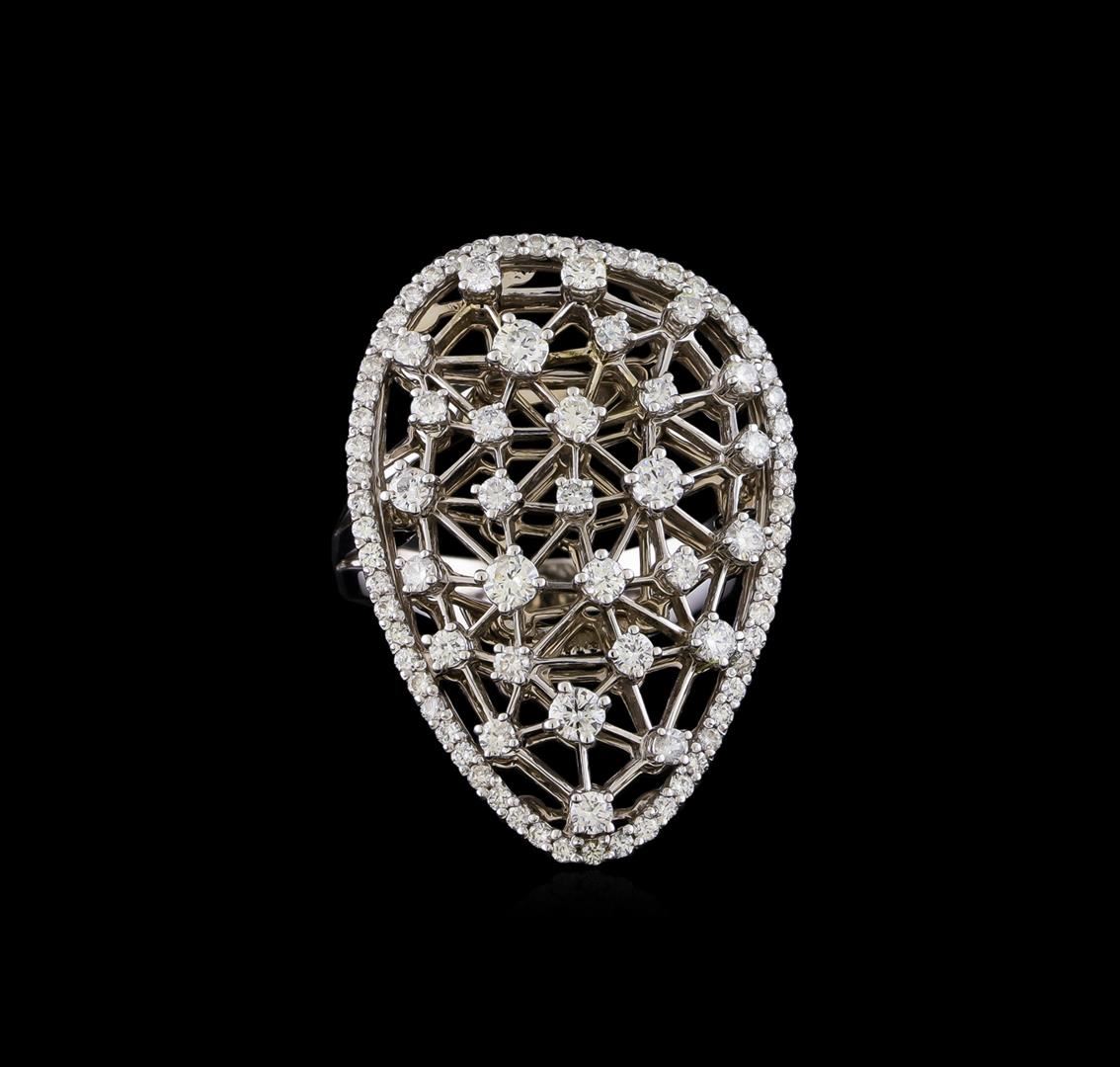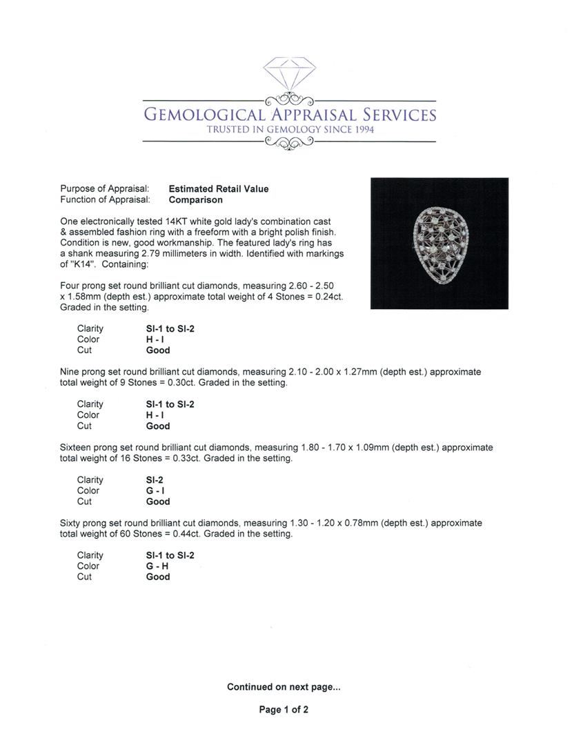 One electronically tested 14KT white gold lady's combination cast & assembled fashion ring with a freeform with a bright polish finish. The featured lady's ring has a shank measuring 2.79 millimeters in width. Identified with markings of "K14". Condition is new, good workmanship. Containing: Four prong set round brilliant cut diamonds, measuring 2.60 - 2.50 x 1.58mm (depth est.) approximate total weight of 4 Stones = 0.24ct. Graded in the setting. Clarity: SI-1 to SI-2. Color: H - I. Cut Good Nine prong set round brilliant cut diamonds, measuring 2.10 - 2.00 x 1.27mm (depth est.) approximate total weight of 9 Stones = 0.30ct. Graded in the setting. Clarity: SI-1 to SI-2. Color: H - I. Cut Good Sixteen prong set round brilliant cut diamonds, measuring 1.80 - 1.70 x 1.09mm (depth est.) approximate total weight of 16 Stones = 0.33ct. Graded in the setting. Clarity: SI-2. Color: G - I. Cut Good Sixty prong set round brilliant cut diamonds, measuring 1.30 - 1.20 x 0.78mm (depth est.) approximate total weight of 60 Stones = 0.44ct. Graded in the setting. Clarity: SI-1 to SI-2. Color: G - Good. Total Weight of Diamonds 1.31ct. Total Weight of Ring 9.70gm. GAS Appraised at $5,150.00.