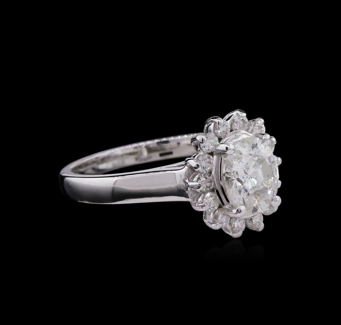 One electronically tested 14KT white gold lady's cast wedding ring with a basket halo with a bright polish finish. The featured lady's ring has a shank measuring 2.13 millimeters wide. Identified with markings of "14K". Condition is new, good workmanship. Containing: One prong set oval shaped cut diamond, measuring 7.03 x 5.76 x 3.80mm (depth est.) approximate weight of 0.98ct. Graded in the setting. Clarity: I-1. Color: I. Cut Good Fourteen prong set round brilliant cut diamonds, measuring 1.80 - 1.75 x 1.16mm (depth est.) approximate total weight of 14 Stones = 0.33ct. Graded in the setting. Clarity: SI-1 to I-1. Color: H - I. Cut Good. Total Weight of Diamonds 1.31ct. Total Weight of Ring 4.00gm. GAS Appraised.