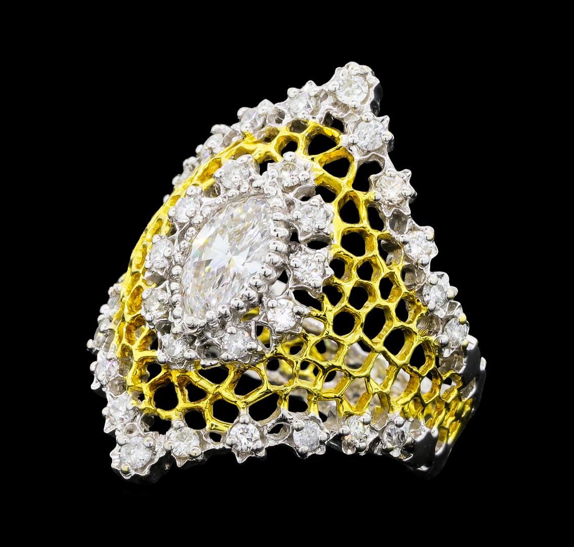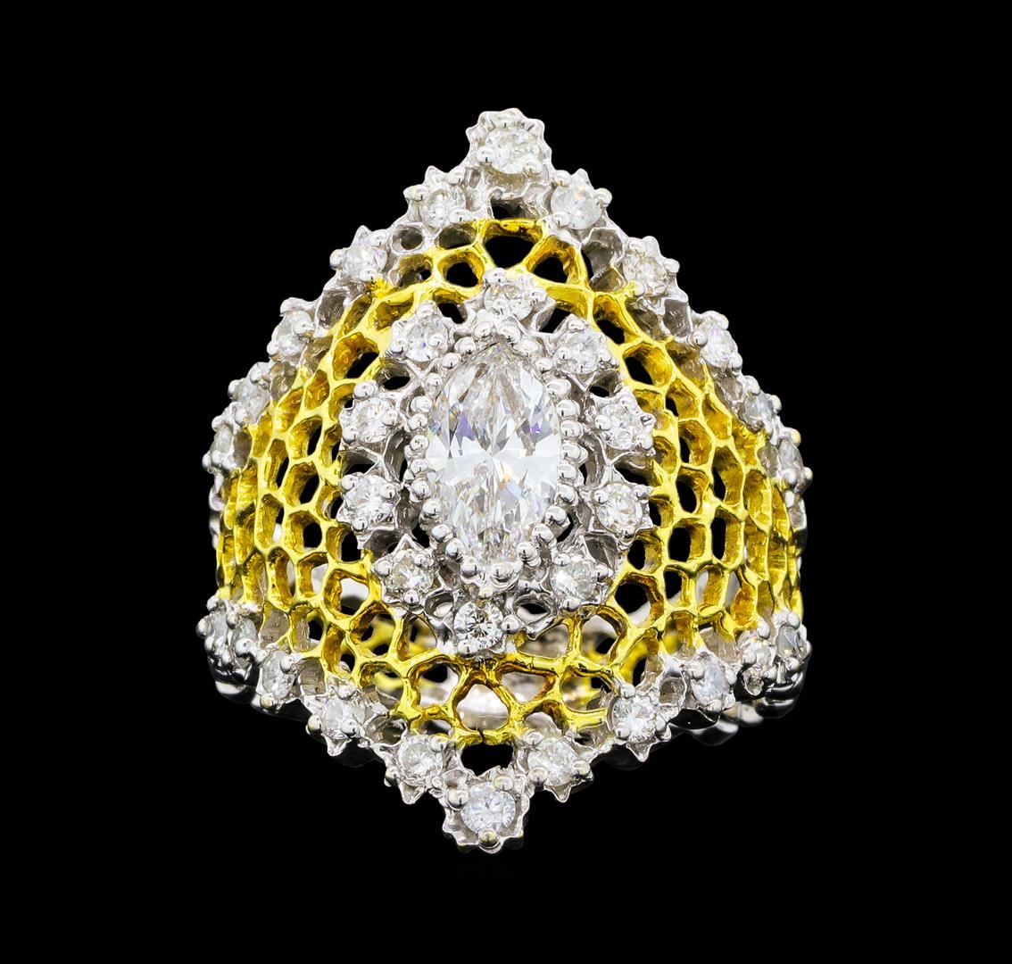 One electronically tested 18KT white gold lady's cast wedding ring with a tapered shank with a bright polish with milgrain detailing finish. The featured lady's ring has 18KT yellow gold plated accents and a shank measuring 5.05 millimeters wide. Identified with markings of '18K 750'. Condition is new, good workmanship. Containing: One prong set marquise shaped cut diamond, measuring 8.70 x 4.70 x 3.00mm (depth est.) approximate weight of 0.71ct. Graded in the setting. Color F - G Clarity VS-1 Cut Very Good Thirty-Two prong set round brilliant cut diamonds, measuring 1.80 - 1.60 x 1.02mm (depth est.) approximate total weight of 32 Stones = 0.60ct. Graded in the setting. Color G - H Clarity SI-2 to I-1 Cut Good. Total Weight of Diamonds 1.31ct.. Total Weight of Ring 7.80gm GAS Appraised at $9750.00. GAS Appraised at $9,750.00.