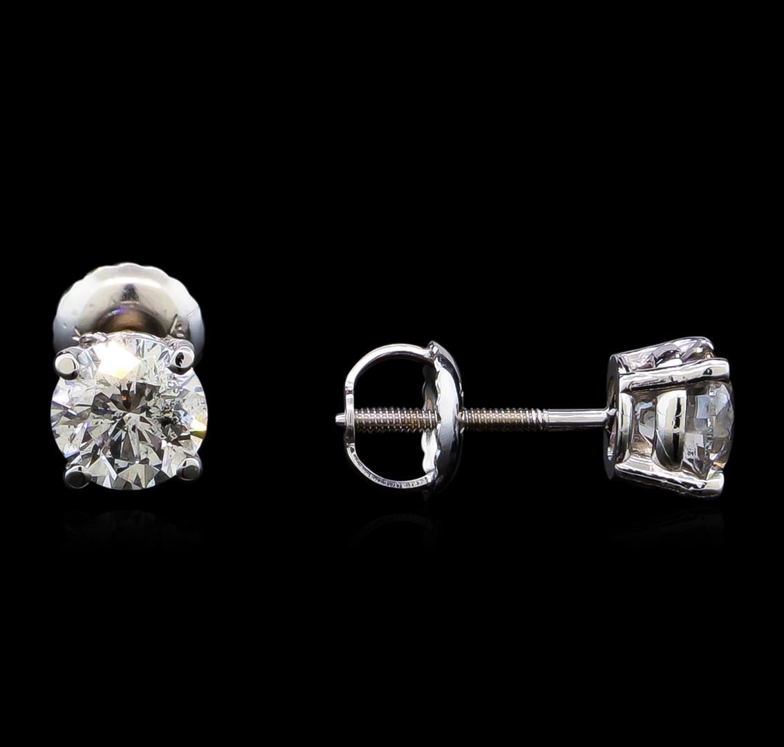One pair electronically tested 14KT white gold lady's combination cast & assembled diamond stud earrings with threaded posts and screw-on/screw-off backs with a basket setting with a bright polish finish. Identified with markings of "14K". Condition is new, good workmanship. Containing: One prong set round brilliant cut diamond, measuring 5.41 - 5.40 x 3.62mm (depth est.) approximate weight of 0.66ct. Graded in the setting. Clarity: SI-2. Color: Very Good One prong set round brilliant cut diamond, measuring 5.41 - 5.39 x 3.53mm (depth est.) , 3.00.%. GTCF approximate weight of 0.65ct. Graded in the setting. Clarity: SI-2. Color: I. Cut Very Good. Total Weight of Diamonds 1.31ct. Total Weight of Stud Earrings 1.10gm. GAS Appraised at $8,075.00.
