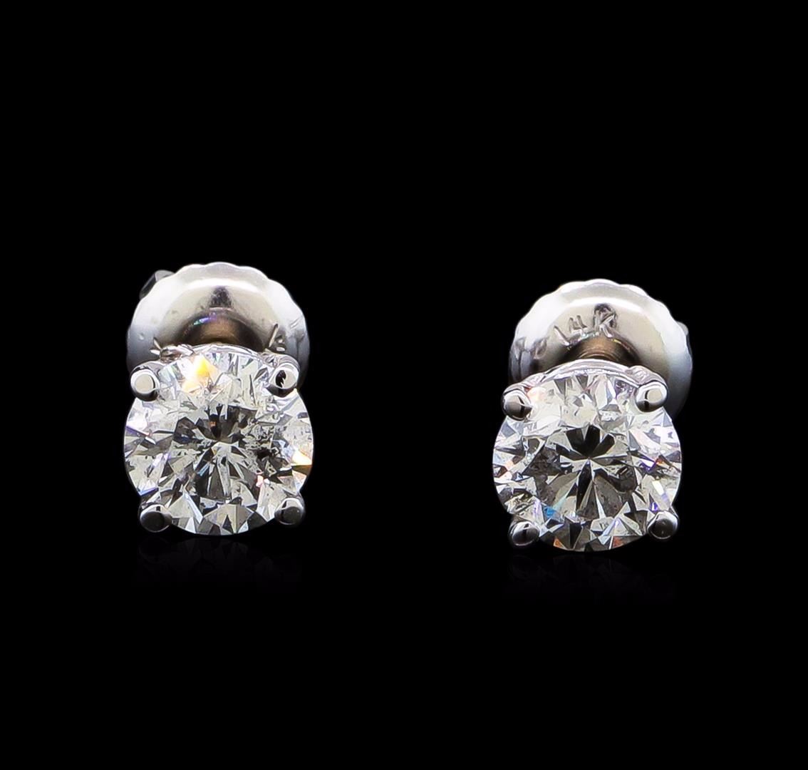 One pair electronically tested 14KT white gold lady's combination cast & assembled diamond stud earrings with threaded posts and screw-on/screw-off backs with a basket setting with a bright polish finish. Identified with markings of "14K". Condition is new, good workmanship. Containing: One prong set round brilliant cut diamond, measuring 5.41 - 5.40 x 3.62mm (depth est.) approximate weight of 0.66ct. Graded in the setting. Clarity: SI-2. Color: Very Good One prong set round brilliant cut diamond, measuring 5.41 - 5.39 x 3.53mm (depth est.) , 3.00.%. GTCF approximate weight of 0.65ct. Graded in the setting. Clarity: SI-2. Color: I. Cut Very Good. Total Weight of Diamonds 1.31ct. Total Weight of Stud Earrings 1.10gm. GAS Appraised at $8,075.00.