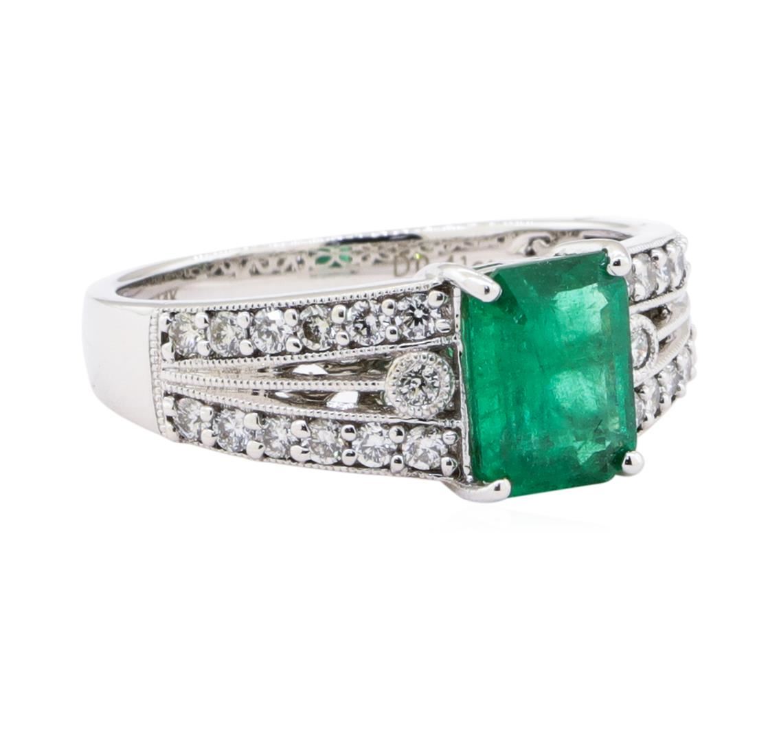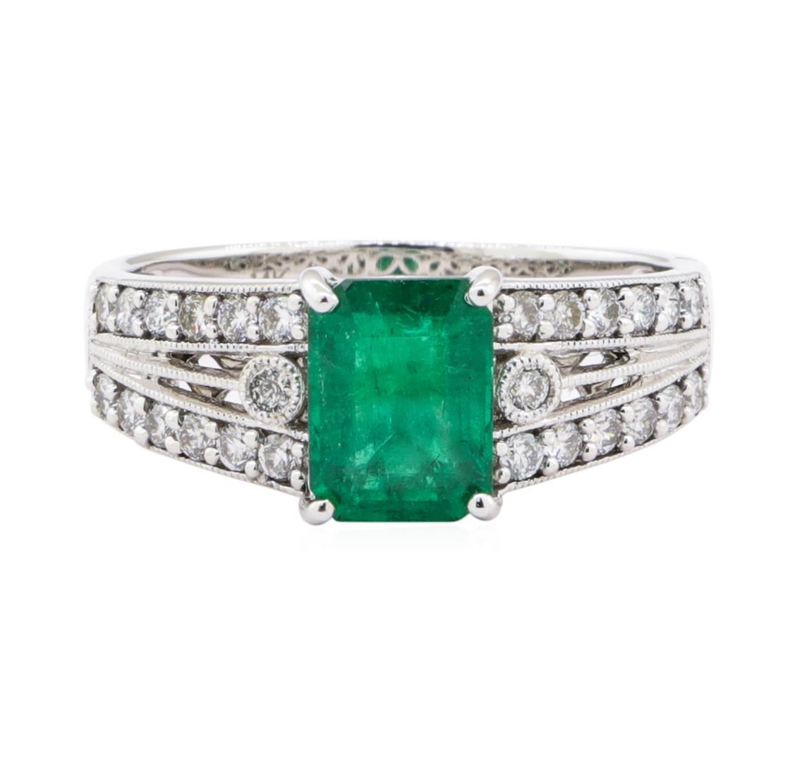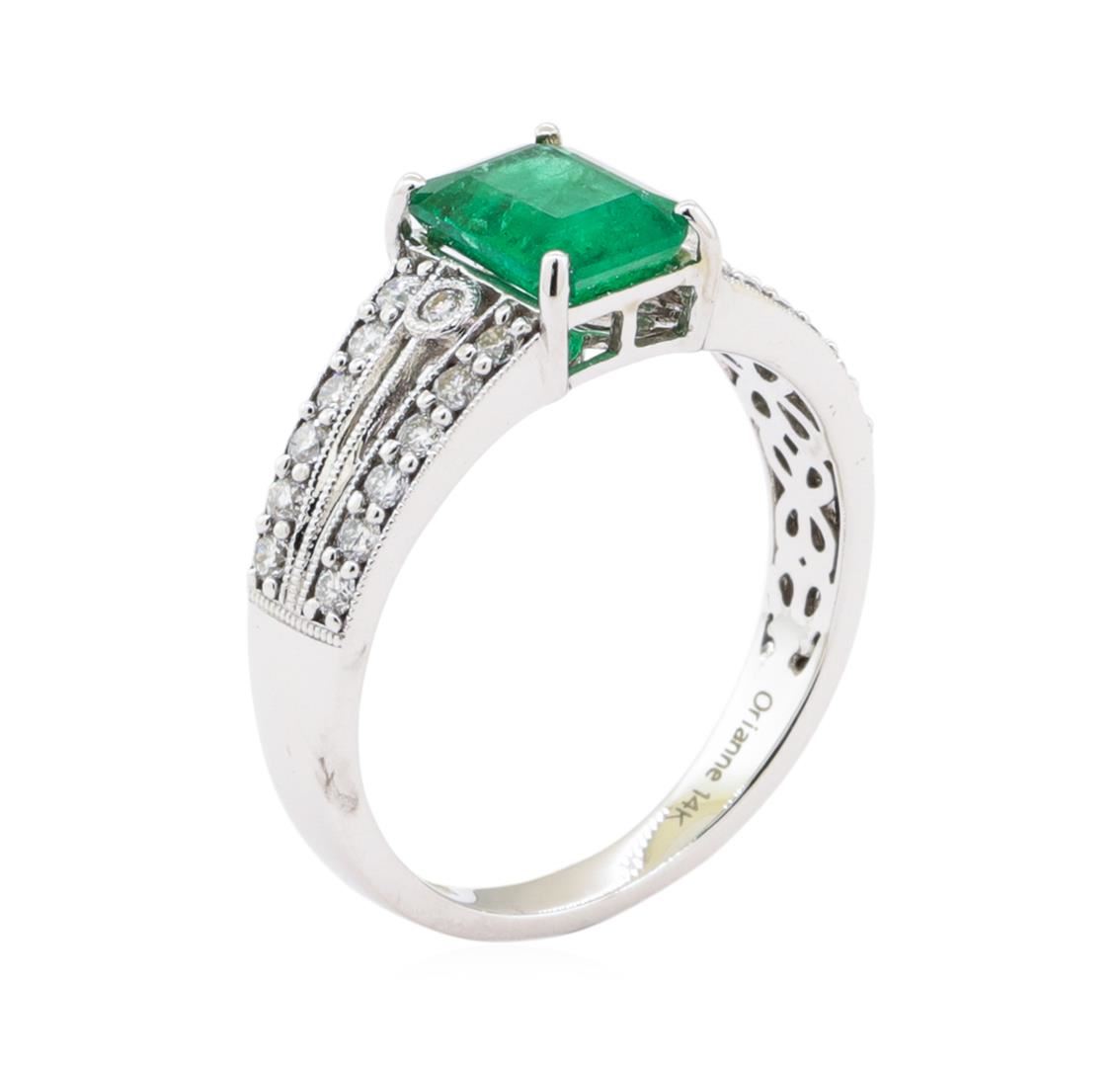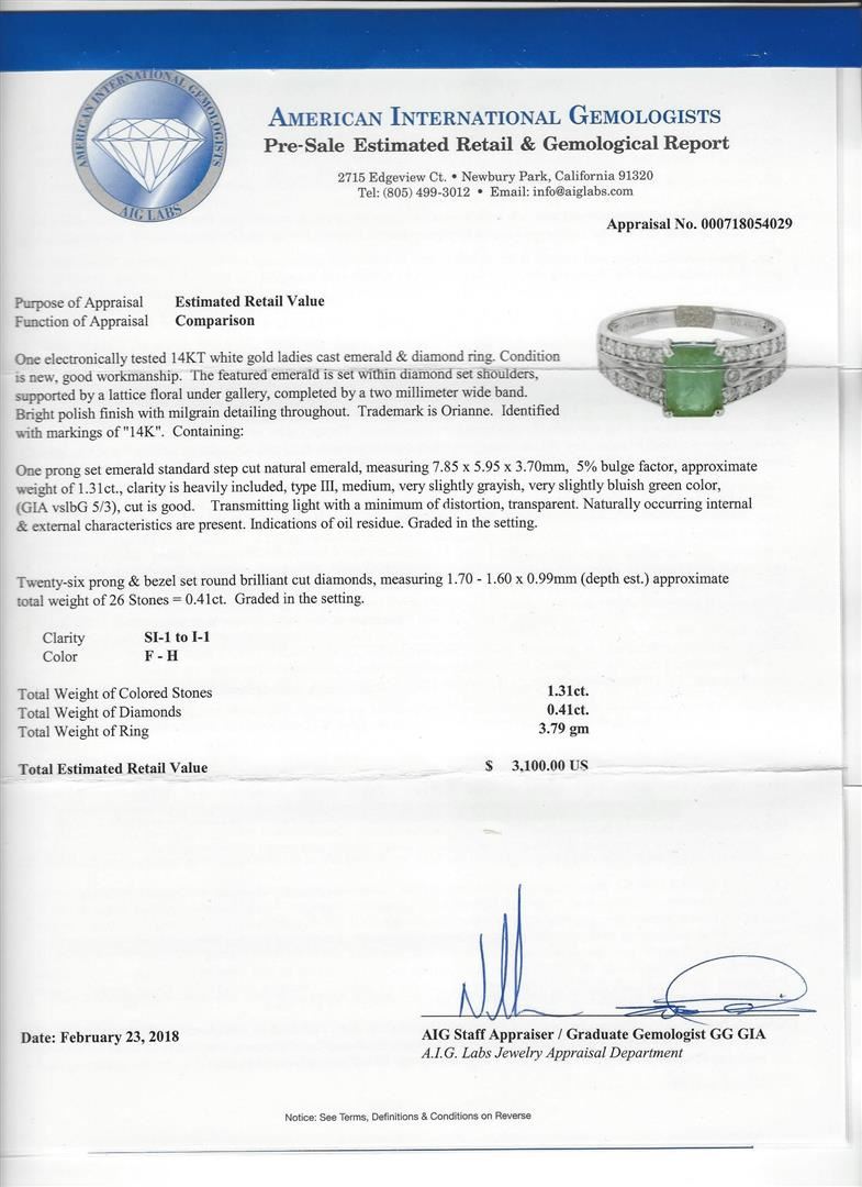 One electronically tested 14KT white gold ladies cast emerald & diamond ring. Condition is new, good workmanship. The featured emerald is set within diamond set shoulders, supported by a lattice ?oral under gallery, completed by a two millimeter wide band. Bright polish ?nish with milgrain detailing throughout. Trademark is Orianne. Identi?ed with markings of "14K". Containing: One prong set emerald standard step cut natural emerald, measuring 7.85 x 5.95 x 3.70mm, 5% bulge factor, approximate weight of l.3lct., clarity is heavily included, type HI, medium, very slightly grayish, very slightly bluish green color, (GIA vslbG 5/ 3), out is good. Transmitting light with a minimum of distortion, transparent. Naturally occurring internal 8; external characteristics are present. Indications of oil residue. Graded in the setting. Twenty-six prong & bezel set round brilliant cut diamonds, measuring 1.70 - 1.60 x 0.99mIn (depth est.) approximate total weight of 26 Stones = 0.41ct. Graded in the setting. Clarity SI-1 to I-1 Color F - H Total Weight of Colored Stones 1.31ct. Total Weight of Diamonds 0.41ct. Total Weight of Ring 3.79 gm Total Estimated Retail Value $ 3,100.00 US