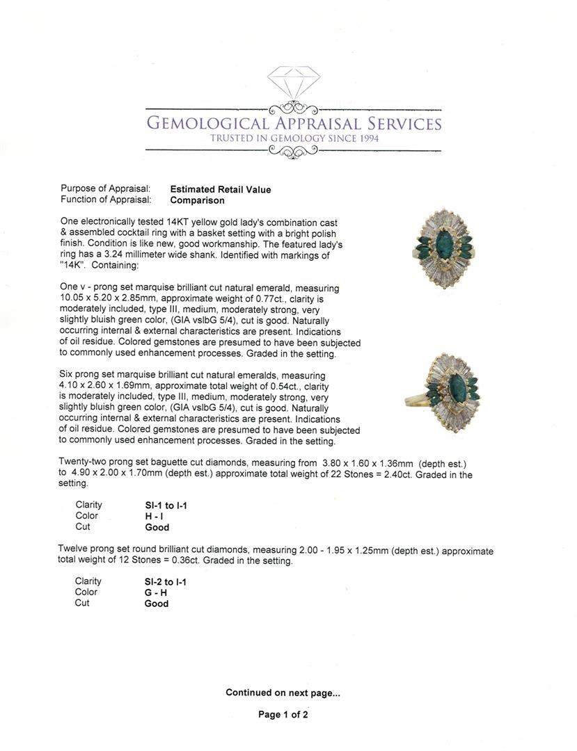 One electronically tested 14KT yellow gold lady's combination cast & assembled cocktail ring with a basket setting with a bright polish finish. The featured lady's ring has a 3.24 millimeter wide shank. Identified with markings of "14K". Condition is like new, good workmanship. Containing: One v - prong set marquise brilliant cut natural emerald, measuring 10.05 x 5.20 x 2.85mm, approximate weight of 0.77ct., clarity is moderately included, type III, medium, moderately strong, very slightly bluish green color, (GIA vslbG 5/4), cut is good. Naturally occurring internal & external characteristics are present. Indications of oil residue. Colored gemstones are presumed to have been subjected to commonly used enhancement processes. Graded in the setting. Six prong set marquise brilliant cut natural emeralds, measuring 4.10 x 2.60 x 1.69mm, approximate total weight of 0.54ct., clarity is moderately included, type III, medium, moderately strong, very slightly bluish green color, (GIA vslbG 5/4), cut is good. Naturally occurring internal & external characteristics are present. Indications of oil residue. Colored gemstones are presumed to have been subjected to commonly used enhancement processes. Graded in the setting. Twenty-Two prong set baguette cut diamonds, measuring from 3.80 x 1.60 x 1.36mm (depth est.) to 4.90 x 2.00 x 1.70mm (depth est.) approximate total weight of 22 Stones = 2.40ct. Graded in the setting. Clarity: SI-1 to I-1. Color: H - I. Cut Good Twelve prong set round brilliant cut diamonds, measuring 2.00 - 1.95 x 1.25mm (depth est.) approximate total weight of 12 Stones = 0.36ct. Graded in the setting. Clarity: SI-2 to I-1. Color: G - Good. Total Weight of Colored Stones 1.31ct. Total Weight of Diamonds 2.76ct. Total Weight of Ring 9.10gm. GAS Appraised at $8,425.00.