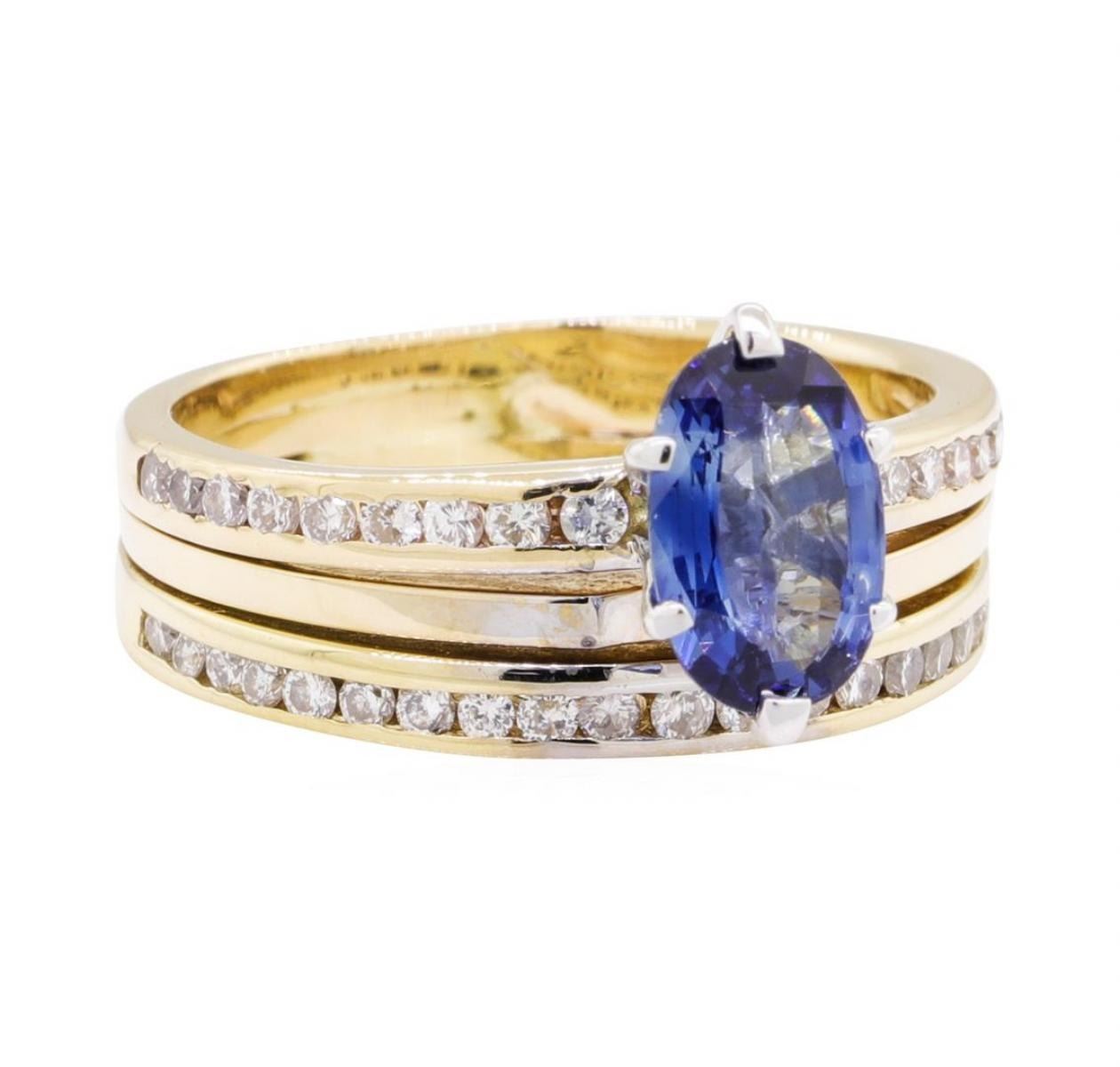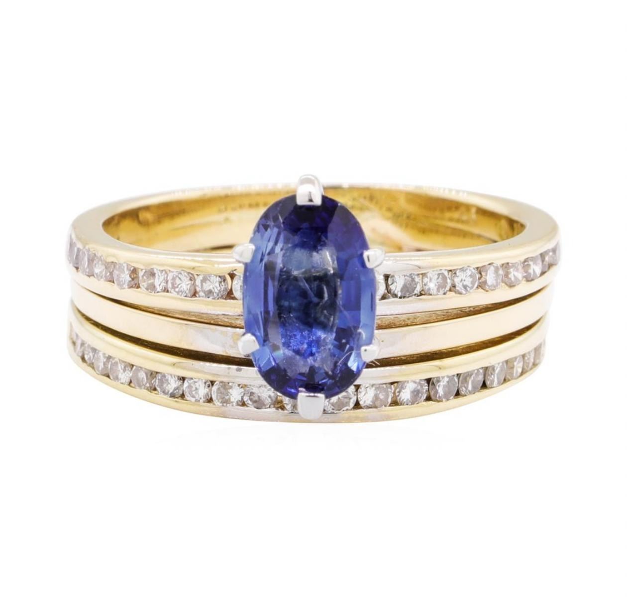 One lady's soldered together wedding set featuring: 14KT yellow gold weighing 5.4 grams containing one sapphire weighing 1.31ct and diamonds weighing 0.40ctw.