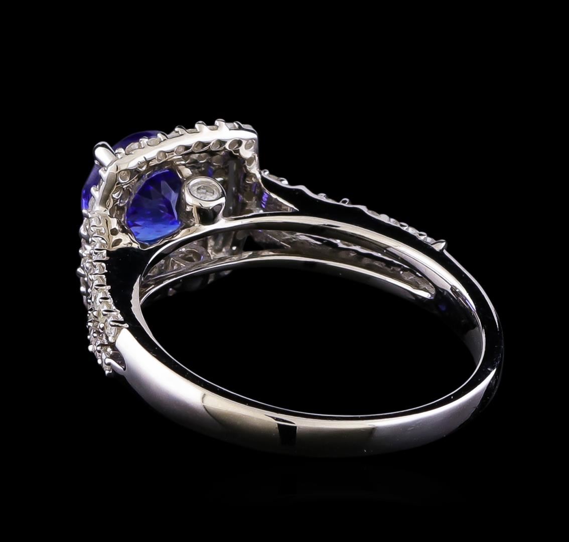 One electronically tested 14KT white gold ladies cast tanzanite and diamond ring with a bright polish finish. The featured tanzanite is set within two tiered diamond bezels supported by diamond set split shoulders, completed by a two millimeter wide band. Trademark is Orianne. Identified with markings of "14K". Condition is new, good workmanship. Containing: One prong set round mixed cut natural tanzanite approximate weight of 1.31ct., clarity is slightly included, type I, medium dark, very slightly grayish, violetish blue color, (GIA vB 6/3), cut is good. Transmitting light with a minimum of distortion, transparent. Naturally occurring internal & external characteristics are present. Graded in the setting. Tanzanite is a very rare gemstone that is only found in the country of Tanzania. Originally discovered in 1967. Tiffany & Company, named the stone Tanzanite. It is found in the Usumburu Mountains that border the Umba Valley of northern Tanzania. Tanzanite occurs in gray, brown, violet, blue, reddish-purple, & green. The gem is interesting because of its exceptional pleochroism. Rotated in different directions a tanzanite will exhibit multiple changes of color. Tanzanite has a low tolerance to ultrasonic cleaning, and should not be cleaned using this method. Eighty-Four prong set round brilliant cut diamonds approximate total weight of 84 Stones = 0.58ct. Graded in the setting. Clarity: I-2 to I-3. Color: H - J. Total Weight of Colored Stones 1.31ct. Total Weight of Diamonds 0.58ct. Total Weight of Ring 3.91gm. AIG Appraised at $4,455.00.