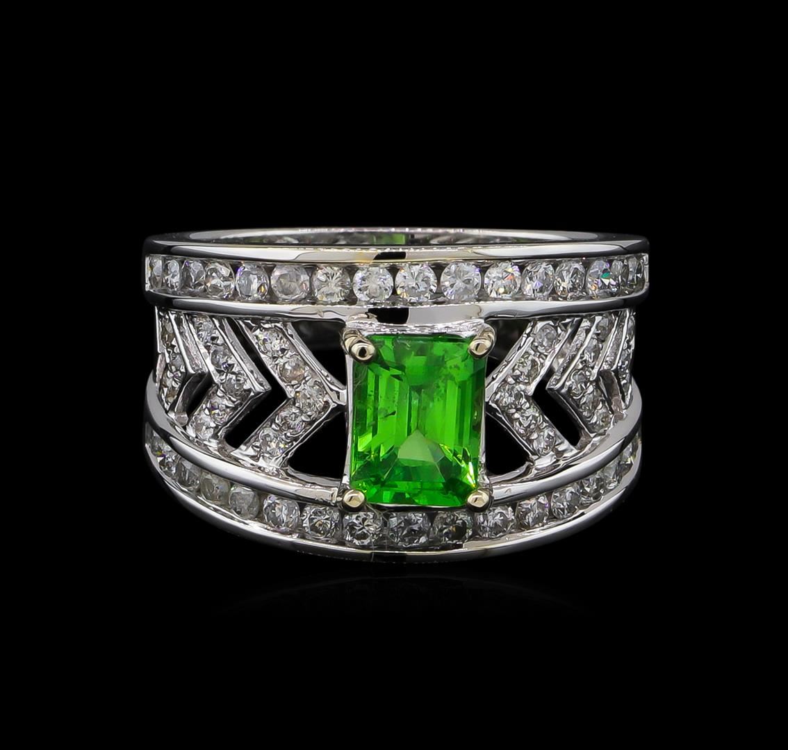 One electronically tested 14KT white gold lady's cast fashion ring with a three row wide band with a bright polish finish. The featured lady's ring has a shank measuring 4.91 millimeters wide. Trademark is Orianne. Identified with markings of "14K". Condition is new, good workmanship. Containing: One prong set emerald step cut natural tsavorite garnet, measuring 6.94 x 5.22 x 3.79mm, approximate weight of 1.31ct., clarity is slightly included, type II, medium, moderately strong, slightly yellowish green color, (GIA slyG 5/4), cut is good. Transmitting light with a minimum of distortion, transparent. Colored gemstones are presumed to have been subjected to commonly used enhancement processes. Graded in the setting. Thirty-Four channel set round brilliant cut diamonds, measuring 1.80 - 1.70 x 1.07mm (depth est.) approximate total weight of 34 Stones = 0.68ct. Graded in the setting. Clarity: SI-1 to I-1. Color: H - I. Cut Good Twenty-Six bead set round brilliant cut diamonds, measuring 1.30 - 1.20 x 0.78mm (depth est.) approximate total weight of 26 Stones = 0.20ct. Graded in the setting. Clarity: SI-2 to I-1. Color: H - I. Cut Good. Total Weight of Colored Stones 1.31ct. Total Weight of Diamonds 0.88ct. Total Weight of Ring 6.60gm. GAS Appraised at $7,115.00.