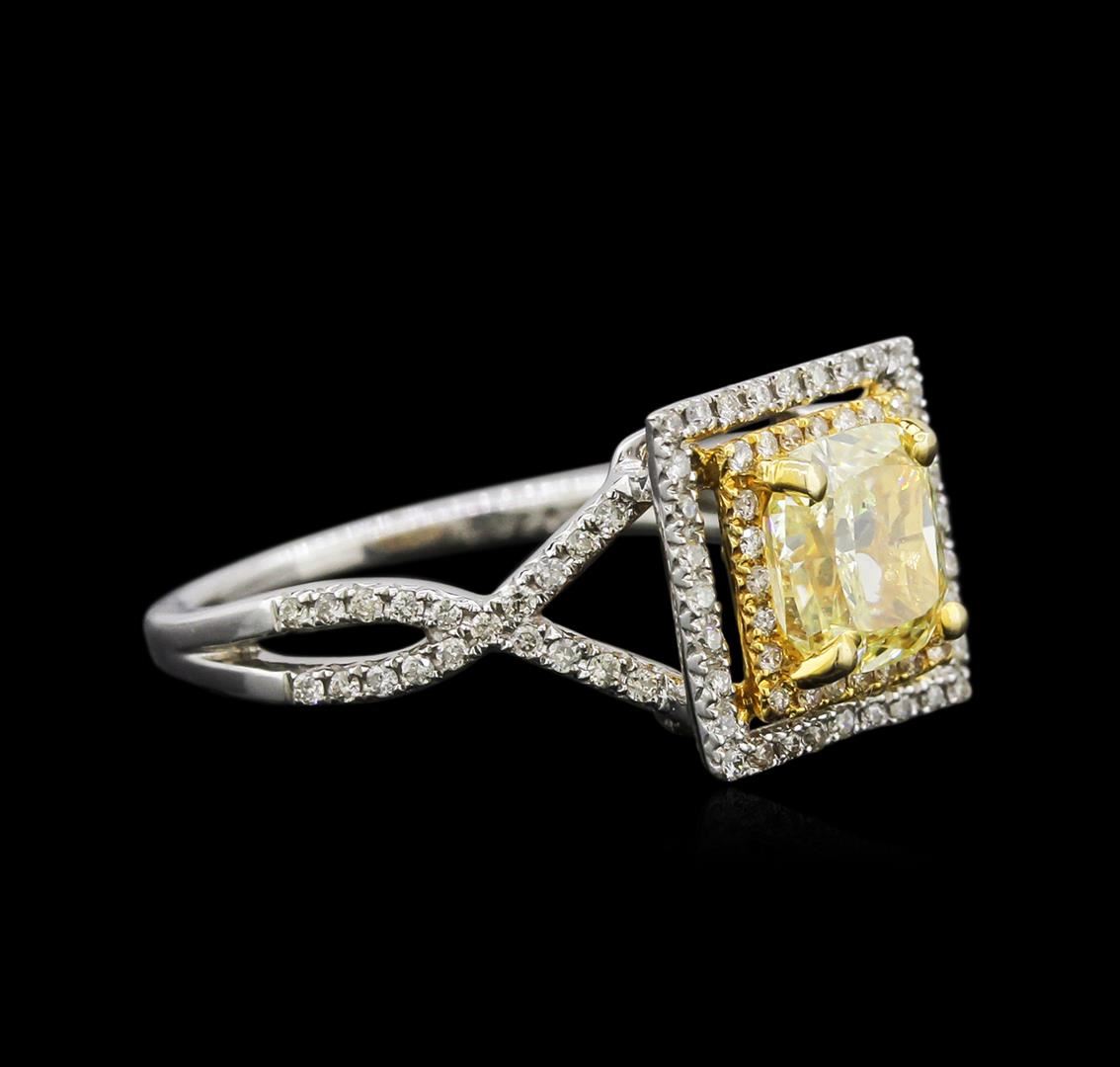 One electronically tested 14KT white gold ladies cast & assembled diamond ring. Condition is new, good workmanship. The featured diamond is set within an inner 14KT yellow gold overlay diamond bezel and an outer 14KT white gold diamond bezel. The ring is supported by intertwining diamond set shoulders, completed by a one millimeter wide band. Bright polish finish. Identified with markings of "14K". Containing: One prong set cushion cut diamond, measuring 6.00 x 5.60 x 3.30mm (depth est.) approximate weight of 1.01ct with a faint blue fluorescence. Diamond Grading Report attached. Graded in the setting. Clarity: SI-2. Color: Light Yellow. Depth: 58.9%. Table: 66.1%. Ninety-four prong set round brilliant cut diamonds, measuring 1.00 - 0.90 x 0.57mm (depth est.) approximate total weight of 94 Stones = 0.30ct. Graded in the setting. Clarity: SI-1 to I-1. Color: G - I. Total Weight of Diamonds: 1.31ct. Total Weight of Ring: 2.60 gm. AIG Appraised at $7,590.00.