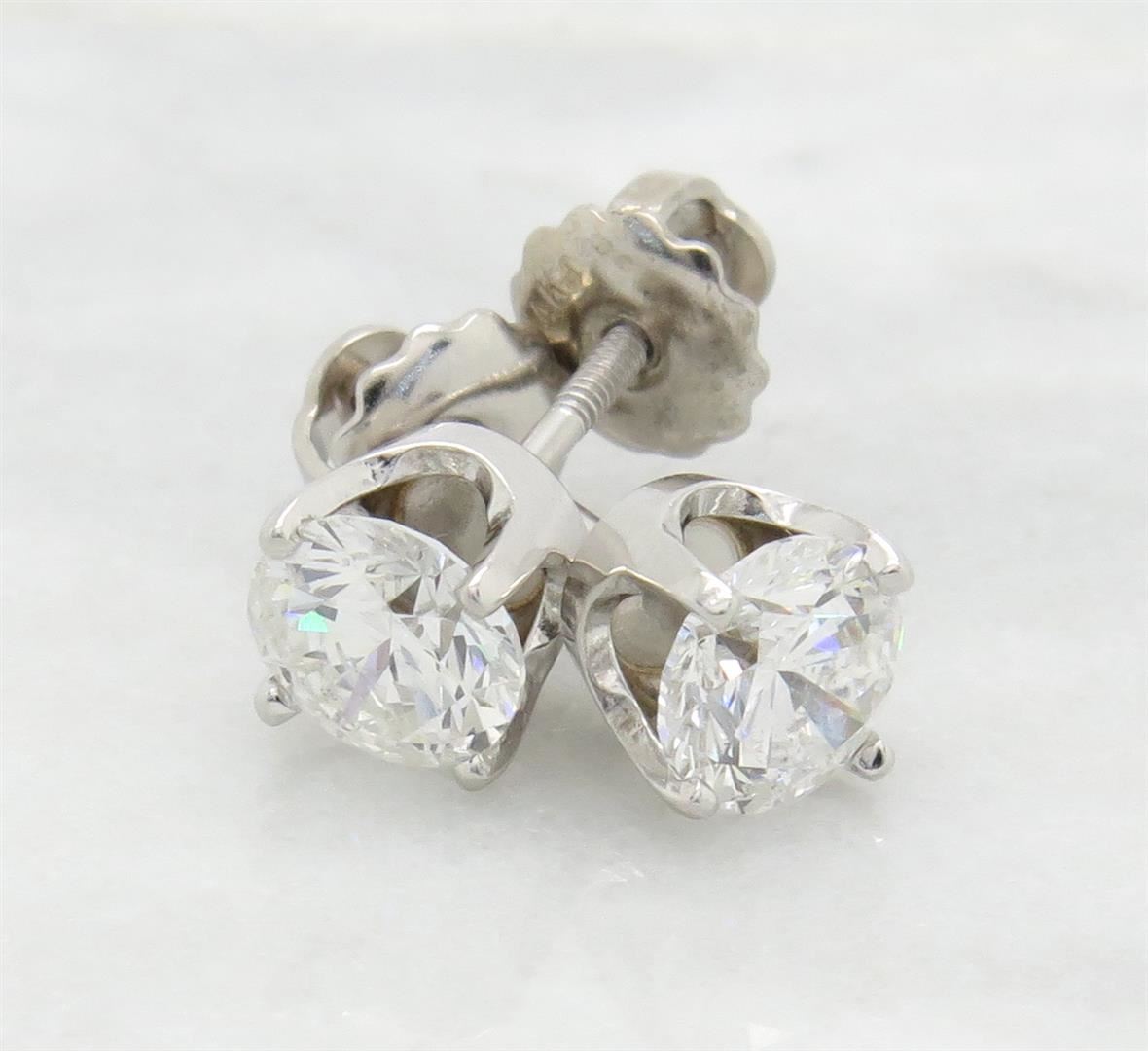 One tested pair of 14K white gold diamond earrings. Containing: Two Round Brilliant Cut Diamonds. Clarity: I, Color: F-G. Approximate total diamond weight: 1.31CTW. Diamonds are graded in the mounting, unless otherwise stated. Weight of earrings: 1.6 grams.