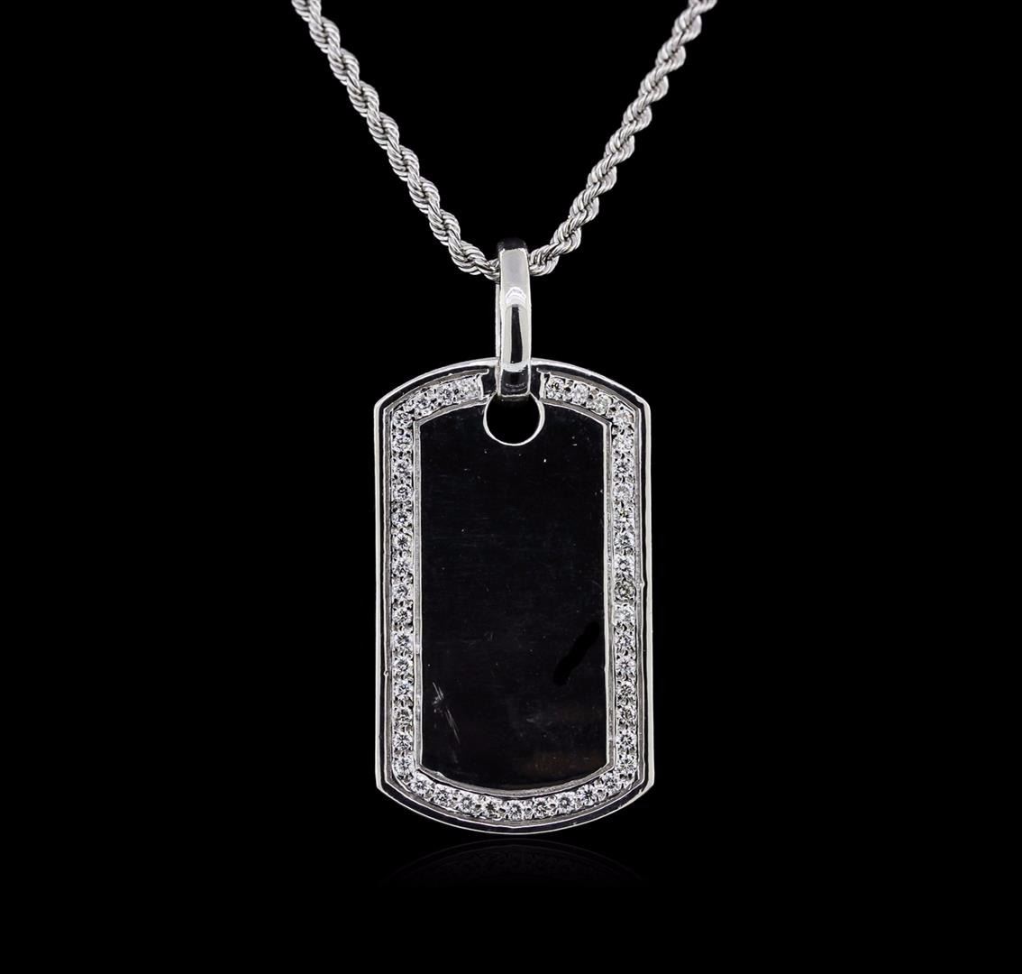 One electronically tested 14KT white gold mens cast diamond tag pendant and chain 18.0" long, with a lobster claw clasp with a bright polish finish. Identified with markings of "14K". Condition is new. Containing: Forty-Five prong set round brilliant cut diamonds, measuring 2.00 - 2.00 x 1.20mm (depth est.) approximate total weight of 45 Stones = 1.31ct. Clarity: VS-2 to SI-1. Color: H - I, Cut is Good. Diamonds are graded in the mounting, unless otherwise stated. Total Weight of Diamonds 1.31ct. Total Weight of Tag Pendant And Chain 39.70 grams. GGL Appraised at $7,435.00.