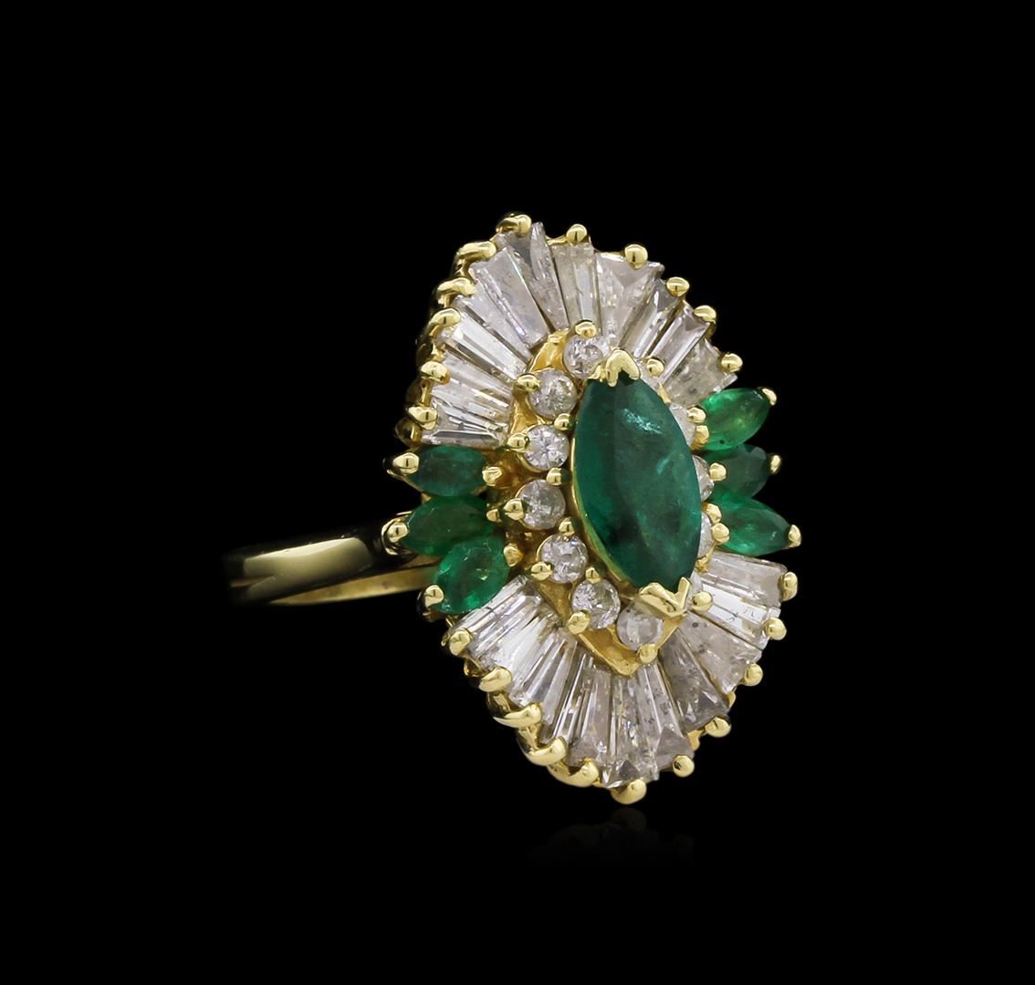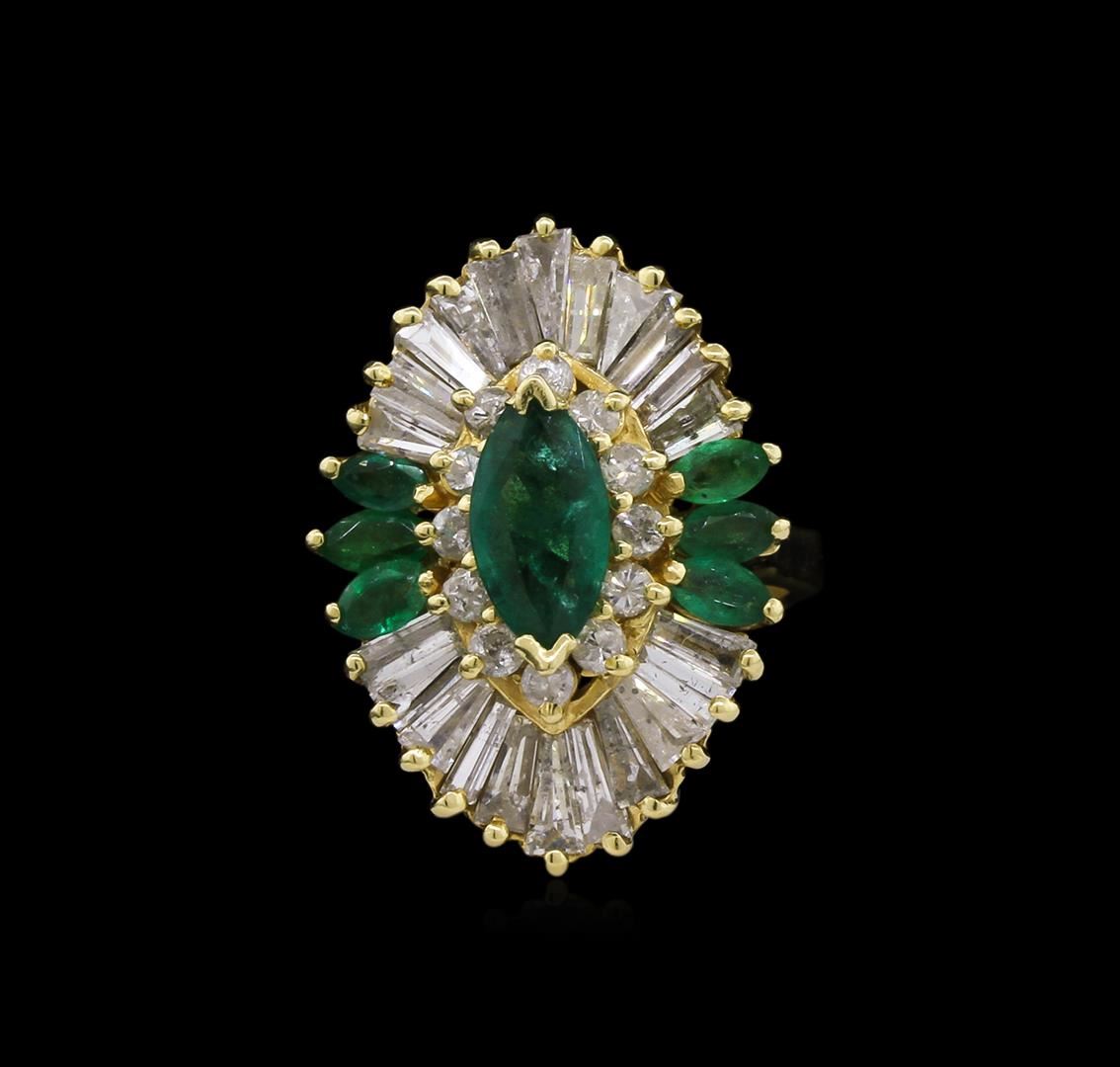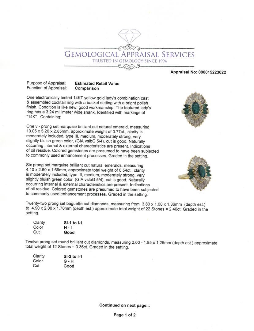 One electronically tested 14KT yellow gold lady's combination cast & assembled cocktail ring with a basket setting with a bright polish finish. The featured lady's ring has a 3.24 millimeter wide shank. Identified with markings of "14K". Condition is like new, good workmanship. Containing: One v - prong set marquise brilliant cut natural emerald, measuring 10.05 x 5.20 x 2.85mm, approximate weight of 0.77ct., clarity is moderately included, type III, medium, moderately strong, very slightly bluish green color, (GIA vslbG 5/4), cut is good. Naturally occurring internal & external characteristics are present. Indications of oil residue. Colored gemstones are presumed to have been subjected to commonly used enhancement processes. Graded in the setting. Six prong set marquise brilliant cut natural emeralds, measuring 4.10 x 2.60 x 1.69mm, approximate total weight of 0.54ct., clarity is moderately included, type III, medium, moderately strong, very slightly bluish green color, (GIA vslbG 5/4), cut is good. Naturally occurring internal & external characteristics are present. Indications of oil residue. Colored gemstones are presumed to have been subjected to commonly used enhancement processes. Graded in the setting. Twenty-Two prong set baguette cut diamonds, measuring from 3.80 x 1.60 x 1.36mm (depth est.) to 4.90 x 2.00 x 1.70mm (depth est.) approximate total weight of 22 Stones = 2.40ct. Graded in the setting. Clarity: SI-1 to I-1. Color: H - I. Cut Good Twelve prong set round brilliant cut diamonds, measuring 2.00 - 1.95 x 1.25mm (depth est.) approximate total weight of 12 Stones = 0.36ct. Graded in the setting. Clarity: SI-2 to I-1. Color: G - Good. Total Weight of Colored Stones 1.31ct. Total Weight of Diamonds 2.76ct. Total Weight of Ring 9.10gm. GAS Appraised at $8,425.00.