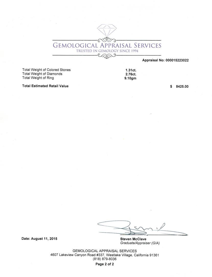 Not all Jewelry, watches or loose stones are appraised and the appraisals are provided for bidders only in certain instances at the discretion of SAA. Our appraisals are conducted by independent third-party appraisal firms. Such firms may be certified GIA Gemologists or have education in the industry or alternative certifications. Appraisals should be used for verification of gemstone and/or metal weight, size, and grade only, not actual value for resale or insurance purposes. Appraisal value should be not considered for actual value, as price varies greatly from retail locations and other merchants in different geographic locations. All Items auctioned by SAA should not be purchased with a view or expectation toward resale for appraisal price given, or to make a profit. The ultimate value for which an item can be resold may vary drastically from the appraisals listed by SAA.