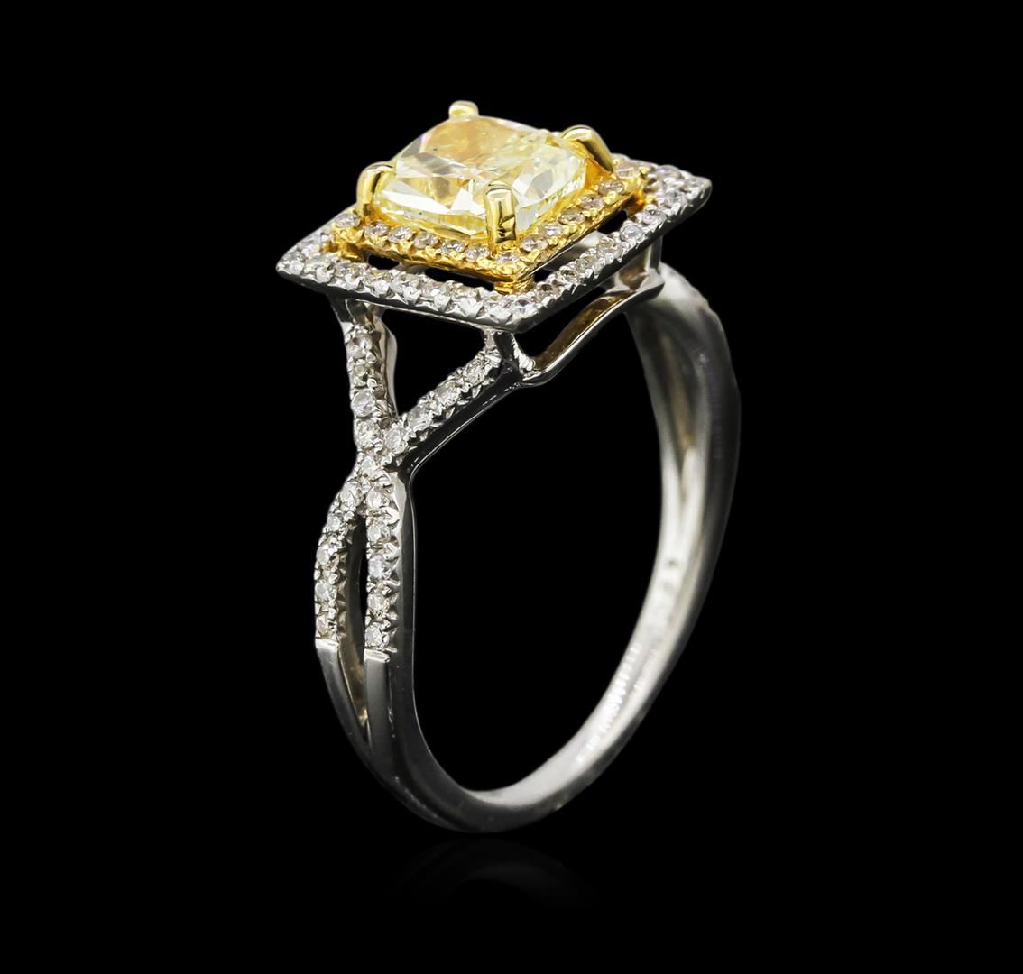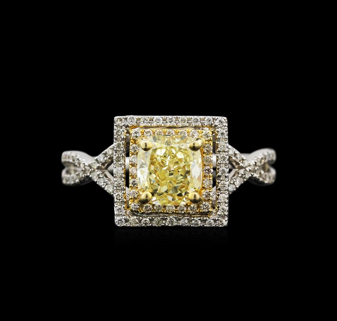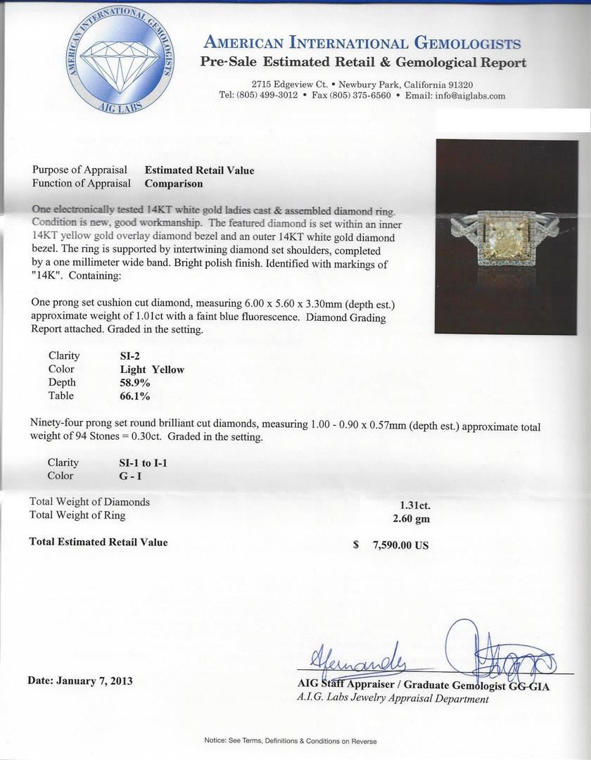 One electronically tested 14KT white gold ladies cast & assembled diamond ring. Condition is new, good workmanship. The featured diamond is set within an inner 14KT yellow gold overlay diamond bezel and an outer 14KT white gold diamond bezel. The ring is supported by intertwining diamond set shoulders, completed by a one millimeter wide band. Bright polish finish. Identified with markings of "14K". Containing: One prong set cushion cut diamond, measuring 6.00 x 5.60 x 3.30mm (depth est.) approximate weight of 1.01ct with a faint blue fluorescence. Diamond Grading Report attached. Graded in the setting. Clarity: SI-2. Color: Light Yellow. Depth: 58.9%. Table: 66.1%. Ninety-four prong set round brilliant cut diamonds, measuring 1.00 - 0.90 x 0.57mm (depth est.) approximate total weight of 94 Stones = 0.30ct. Graded in the setting. Clarity: SI-1 to I-1. Color: G - I. Total Weight of Diamonds: 1.31ct. Total Weight of Ring: 2.60 gm. AIG Appraised at $7,590.00.