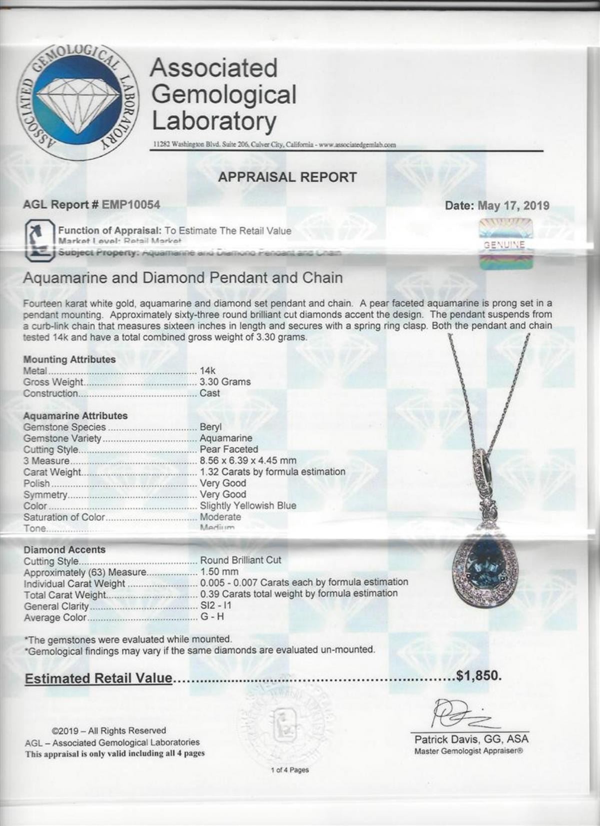 One electronically tested 14KT white gold, aquamarine and diamond set pendant and chain. A pear faceted aquamarine is prong set in a pendant mounting. Approximately sixty-three round brilliant cut diamonds accent the design. The pendant suspends from a curb-link chain that measures sixteen inches in length and secures with a spring ring clasp. Both the pendant and chain tested 14k and have a total combined gross weight of 3.30 grams. Mounting Attributes - Metal: 14KT. Gross Weight: 3.30gm. Construction: Cast. Aquamarine Attributes - Gemstone species: Beryl. Gemstone variety: Aquamarine. Cutting style: Pear faceted. 3 measure: 8.56x6.39x4.45mm. Carat weight: 1.32 carats by formula estimation. Polish: Very good. Symmetry: Very good. Color: Slightly yellowish blue. Saturation of color: Moderate. Tone: Medium. Diamond Accents - Cutting Style: Round brilliant cut. Approximately (63) measure: 1.50mm. Individual carat weight: 0.005-0.007 carats each by formula estimation. Total carat weight: 0.39 carats total weight by formula estimation. General clarity: SI2-I1. Average color: G-H. Estimated retail value $1,850.00 US.