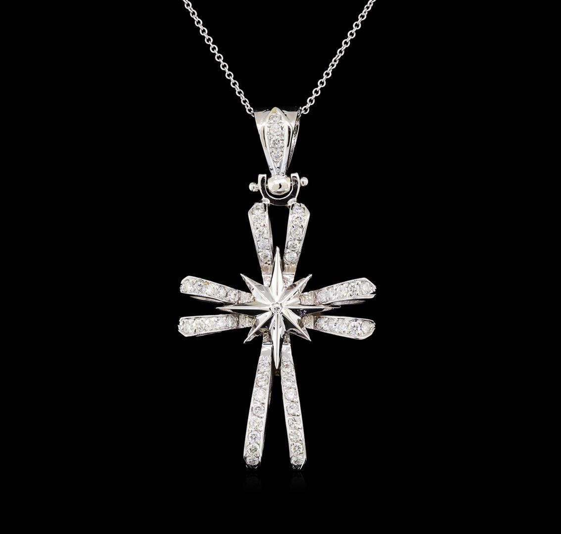 One electronically tested 14KT white gold cast & assembled diamond cross pendant with chain. Two and one-quarter inch length pendant features a stylized double diamond ribbon cross with a center eight-ray star, completed by a stylized diamond set bail. The pendant is supported by a sixteen inch length 14KT white gold cable chain, terminating in a lobster claw clasp. Bright polish finish with milgrain detailing. Identified with markings of "14K". Condition is new, good workmanship. Containing: Fifty-One prong & bezel set round brilliant cut diamonds, measuring 2.00 - 1.80 x 1.14mm (depth est.) approximate total weight of 51 Stones = 1.32ct. Graded in the setting. Clarity: SI-1 to I-1. Color: G - I. Total Weight of Diamonds 1.32ct. Total Weight of Pendant With Chain 24.19gm. AIG Appraised at $7,815.00.