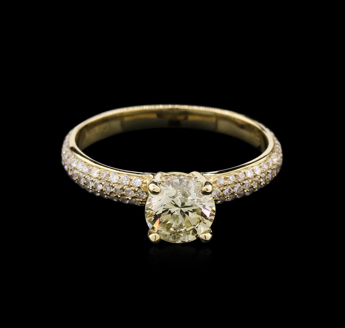One electronically tested 14KT yellow gold ladies cast diamond unity ring with a bright polish finish. The featured diamond is supported by a diamond accented under gallery and diamond set shoulders, completed by a two millimeter wide band. Trademark is Orianne. Identified with markings of "14K". Condition is new, good workmanship. Containing: One prong set round brilliant cut diamond, measuring 6.00 - 5.95 x 3.75mm approximate weight of 0.91ct with a medium strong blue fluorescence. Graded in the setting. Clarity: I-1. Depth: 62.7%. Table 61.9%. One Hundred Twenty-Eight pave‚ set round brilliant cut diamonds approximate total weight of 128 Stones = 0.41ct. Graded in the setting. Clarity: I-1 to I-2. Color: G - I. Total Weight of Diamonds 1.32ct. AIG Appraised at $5,910.00.